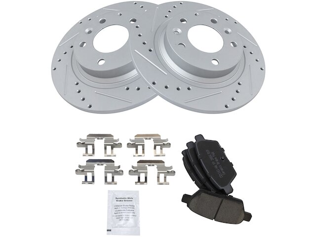 Package Contents: (1) Rear Ceramic Brake Pad Set; (2) Rear Performance Brake Rotors; Brake Pad Contact Point Grease; Brake Pad Hardware