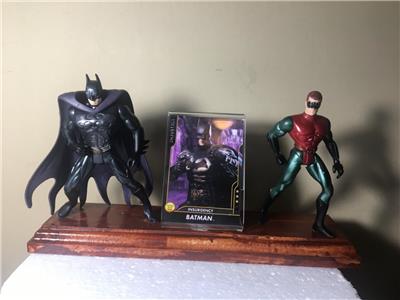 This features Batman & Robin figures along with a special promo card mounted on a wood plaque!. It is a great display with a professionally custom made wood base. The wood base was specially hand cut, sanded, stained and varnished in royal walnut colors. It comes with a plastic acrylic stand up card holder. The figure is affixed permanently to the base and stands approximately 4 inches tall. A lot of work went into this display! It is a one of a kind craft made unique professionally made collectible!