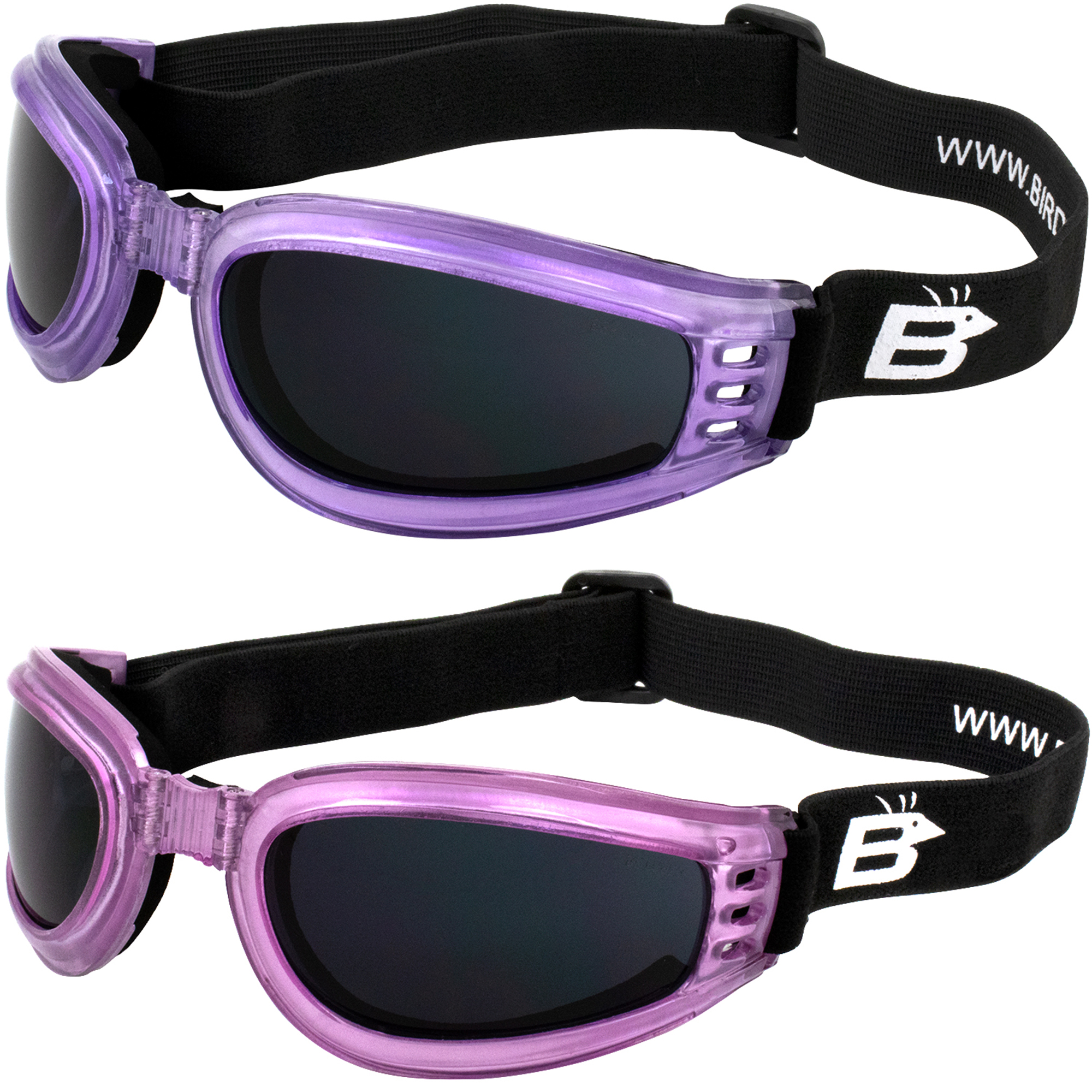Stay safe and protected when you wear a pair of our sweet and colorful Birdz Eyewear Cardinal Women's Motorcycle Goggles. This slim and padded frame also features an adjustable nose bridge that allows it to fold completely in half, making it easy to store in any saddlebag or even your pocket without taking up valuable space. The thin frames are padded with high quality long lasting neoprene foam that will not deteriorate. The bridge's increased range of motion makes for a comfortable, more tailored fit. When you purchase this set, you'll receive one pair of our Birdz Eyewear Cardinal Pink Goggles with Super Dark Lenses and another pair Birdz Eyewear Cardinal Purple Goggles with Super Dark Lenses. Super Dark lenses block the most amount of light, easing eyestrain and providing 100% UVA and UVB protection on super sunny days.