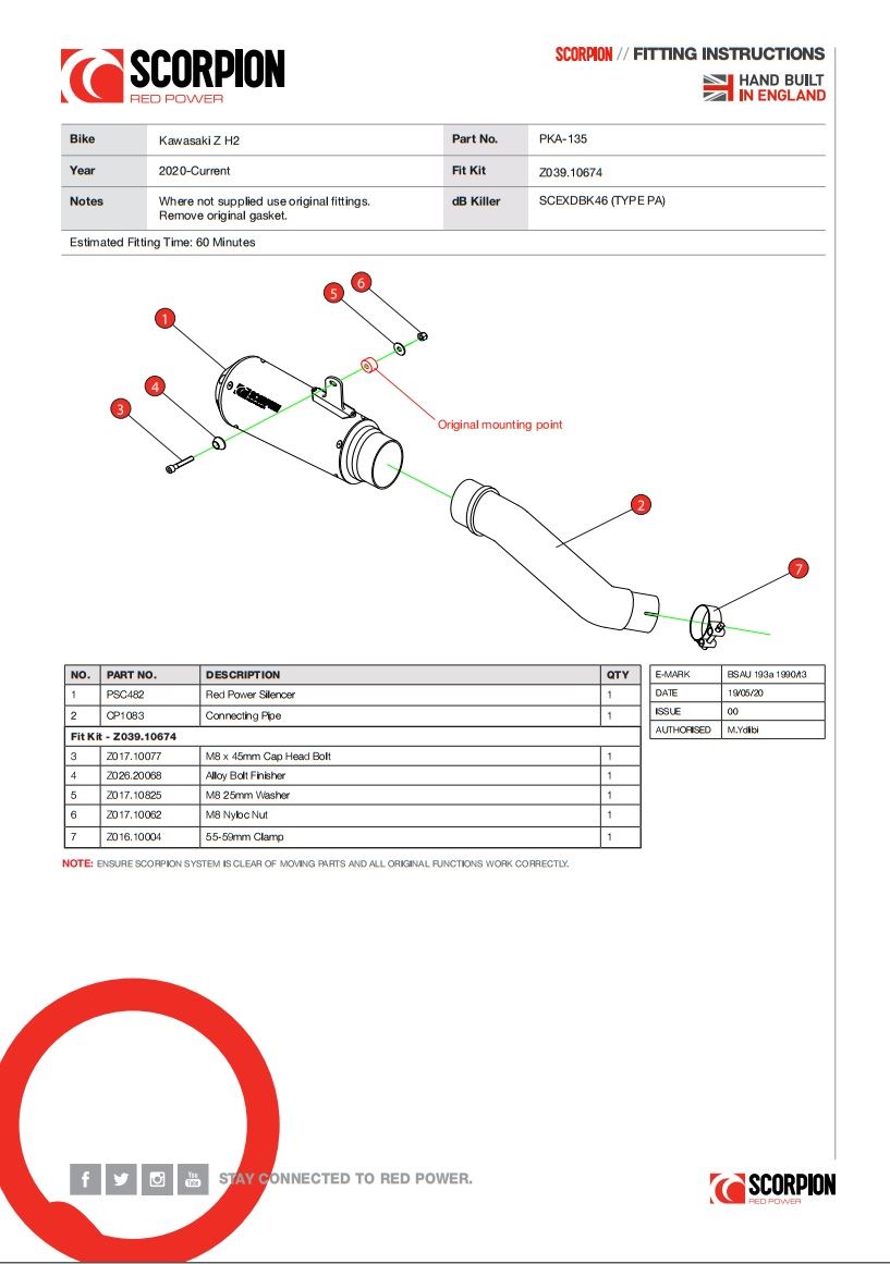 The innovativeexhaust has been dyno developed to suit the ZH2, so no remapping is required, just fit and ride. It's constructed from T304 stainless steel the difference is quality and its all in the feel, no other exhaust feels quite like it. Scorpions continued expertise in iterative design and development processes, combined with a deep and abiding passion for motorcycles creates the best exhausts to create a unique rider experience. Included is a removable baffle or DB (decibel) Killer and the fitting kit for a straight forward installation. You have everything you need to fit the exhaust to your bike.