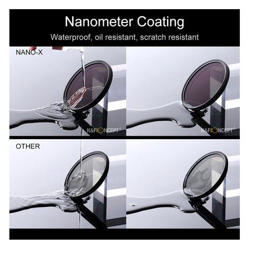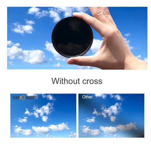 K&F Concept Nano-X Variable Fader NDX HD Green-Coated Waterproof Anti-Scratch Japan Optics Filter (77mm, ND2-32)No "X" cross on imagesK&F utilize cutting edge technology you're going to say goodbye to this common issue with wide angle lenses and variable ND filters. Nano CoatingIn addition to state-of-the-art MRC, our optical engineers developed new nano coating layer technology, called nanotec, from the ground up to repel dirt, water and other elements by beading rather than absorbing and smearing. Set in our workhorse and built to withstand extreme wind, salt water, dust and other abrasive conditions and elements. Scratch ResistantThe ND filters are made with premium Japan Optics glass, which could resist scratch, protecting your camera lens well.