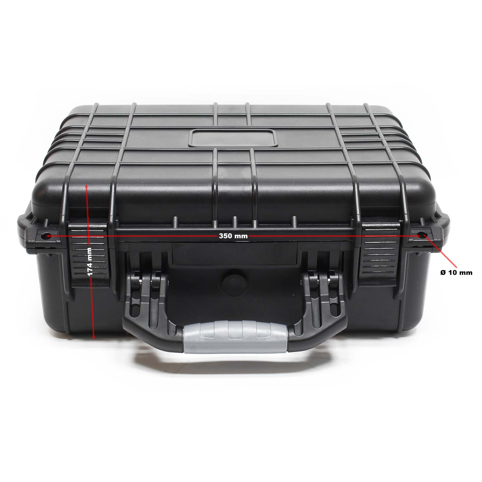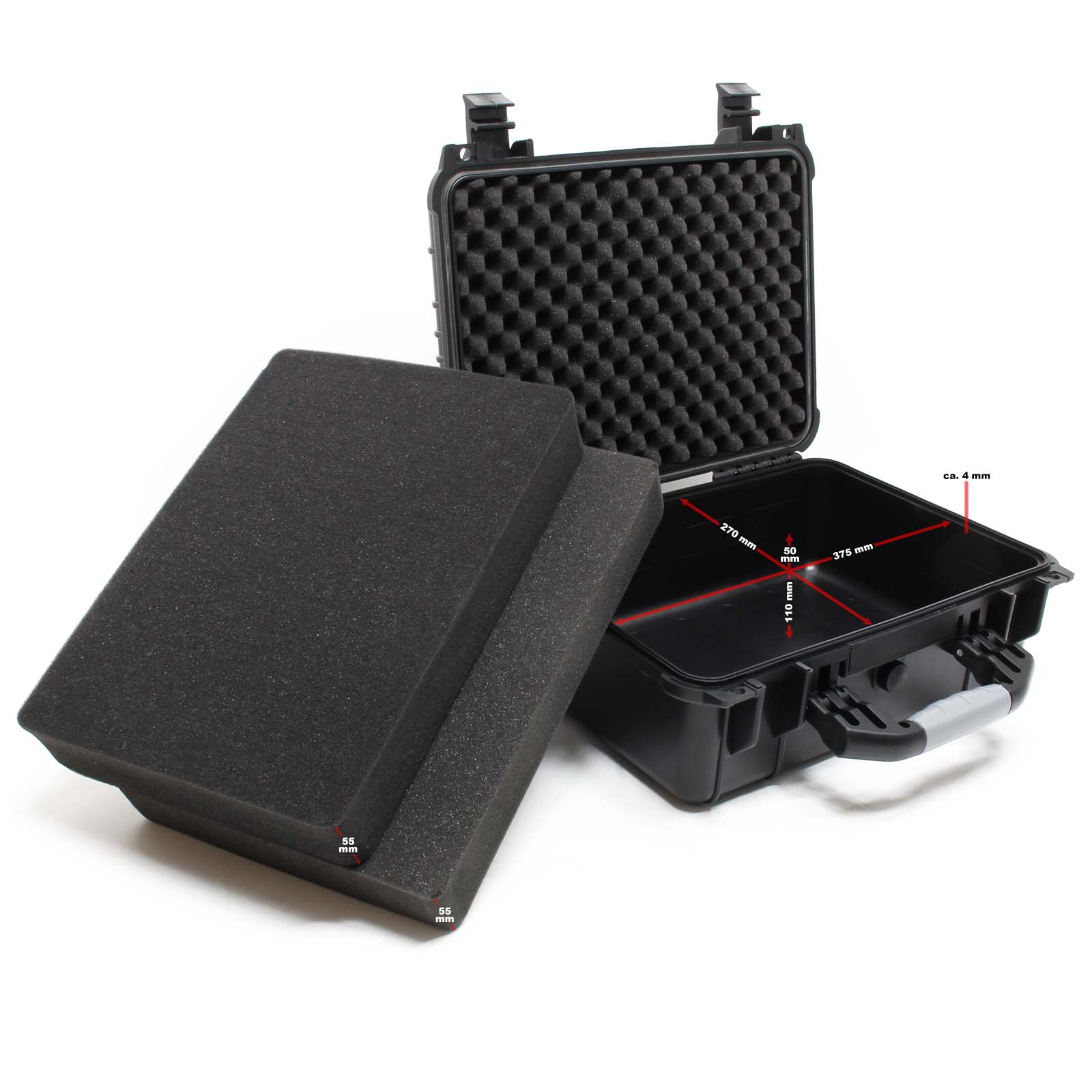 | Application / Information / Caractéristiques | Coque à la fois légère et solide 3 couches de mousse amovibles (mousse à picots dans le couvercle, dés de mousse prédécoupés, mousse de sol fine) Angles arrondis 2 fermetures à ressort Résistant aux chocs, à la pression, à la poussière et à l’humidité Compensation de la pression atmosphérique grâce à la soupape de pressurisation 2 oeillets pour cadenas Ø 10mm |
