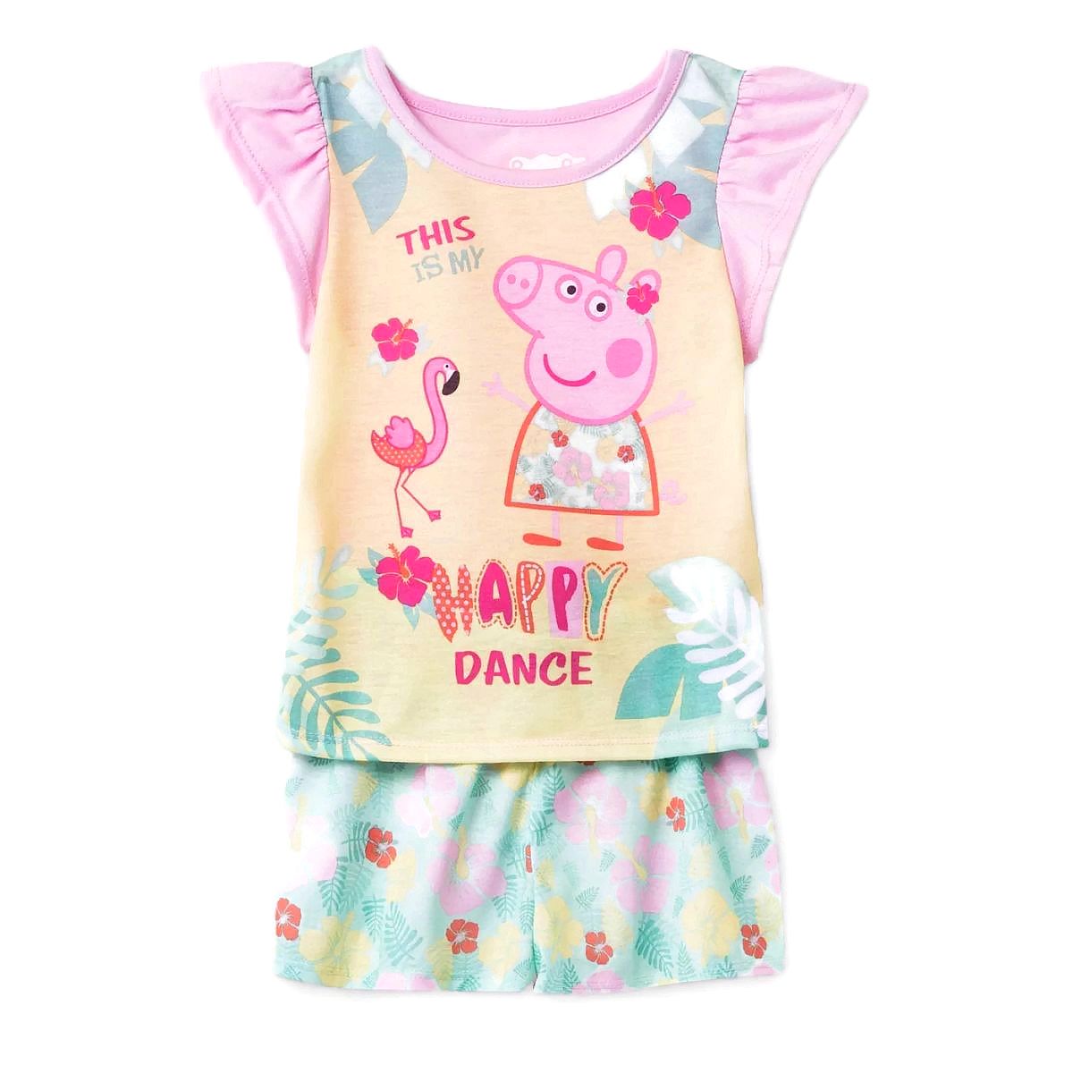 Your Peppa fan will cozy up in style as she heads off to bed with this 2-Piece Peppa Pig Pajama Set to keep her comfortable. This PJ set comes complete with a short-sleeve, pullover-style sleep tee and pretty floral PJ shorts to match. The sleep tee sports a sunny yellow color with pretty pink flutter-sleeves and trim for a cute pop of contrast with Peppa Pig and a flamingo doing her 'happy dance'. The vibrant PJ shorts come adorned with a pretty floral print. and a full-elastic waistband for a custom fit. Of a soft polyester jersey to keep her sleeping comfortably.