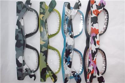 FRAMES ARE FROSTED IN 4 COLORS WITH RHINESTONES AROUND THE LENS.