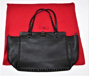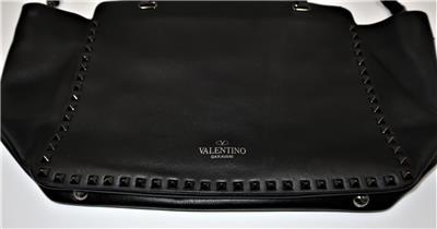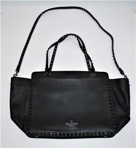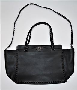 You have found the missing piece to your designer handbag collection! Here is a black leather Rockstud tote from Valentino Garavani, made in Italy. It measures 10" x 13" x 5" deep and has dual handles and a detachable long handle. It comes with red Valentino dust bag. Excellent pre-owned condition. There are a few light impressions on the front where it looks like it was resting on one of the handles (see pictures). Please see our Not Just China Store for more designer handbags.