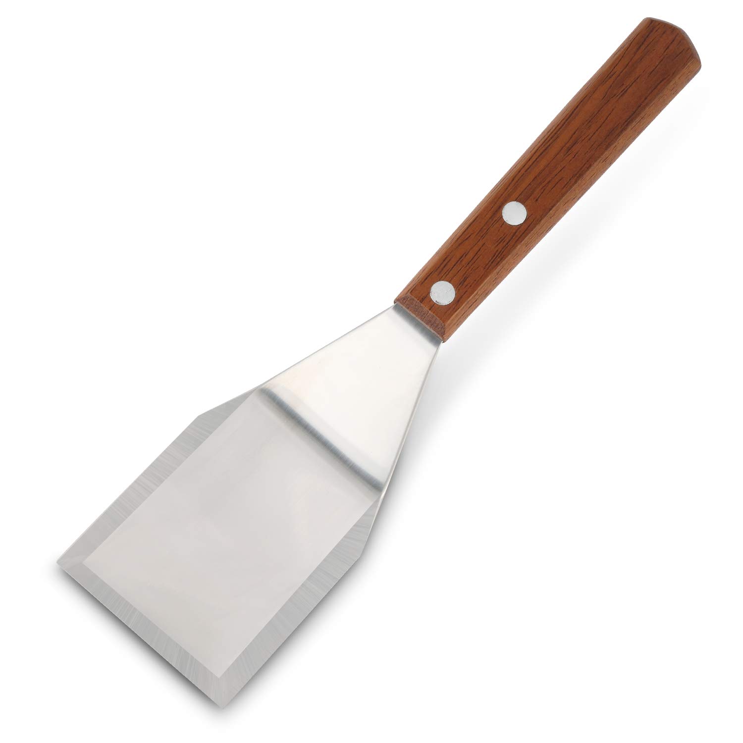 kitchen spatula has a 2.5 x 2.5 inch blade with beveled edges. The blade is