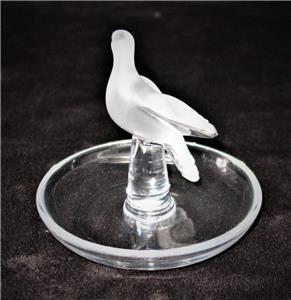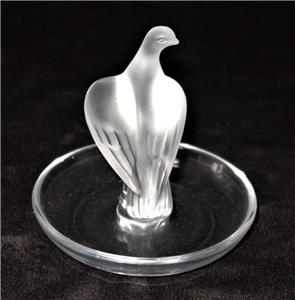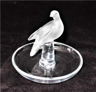 You have found the missing piece to your crystal pattern! Here is a crystal pin dish or trinket tray from Lalique, France called CHARIS with a frosted dove in the center. The words Lalique France are etched on the base. The tray is 3 3/4" across by 3 1/2" tall, and in excellent pre-owned condition, no chips or cracks. Please see our Not Just China Store for more of this pattern.