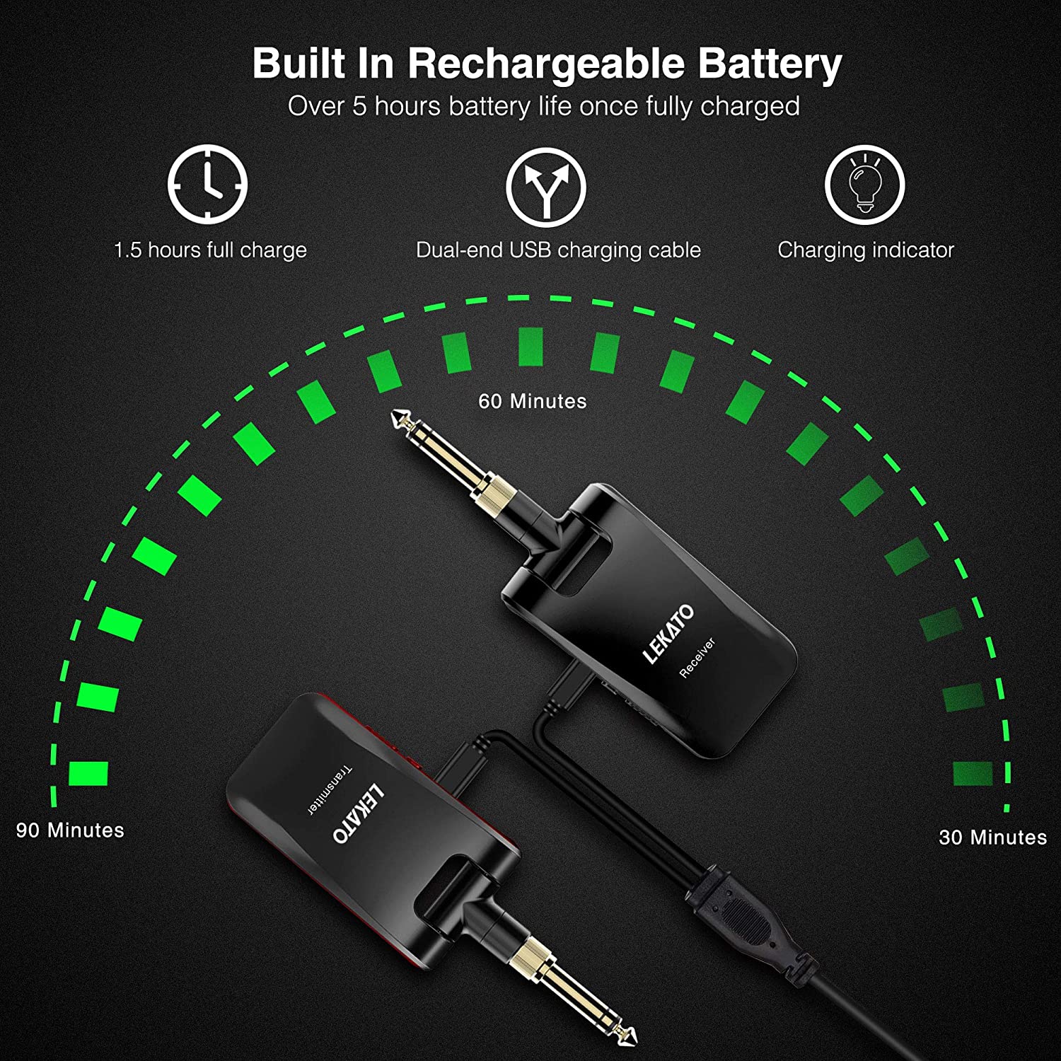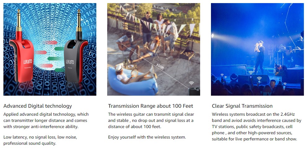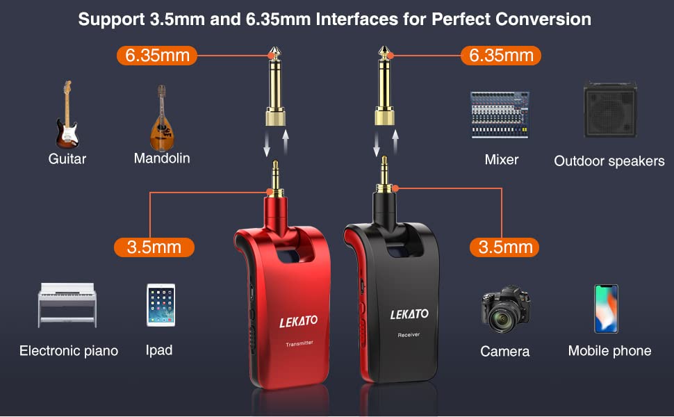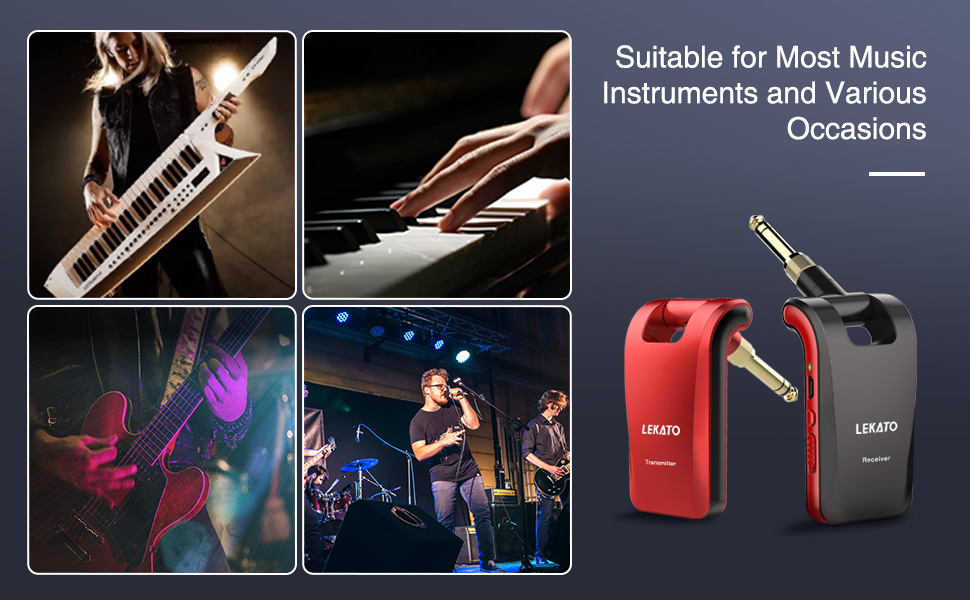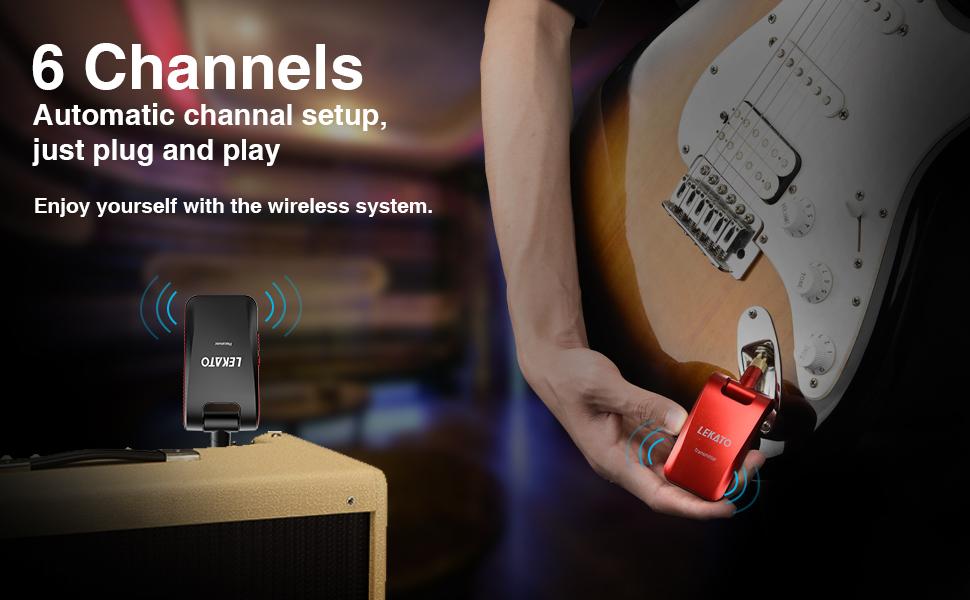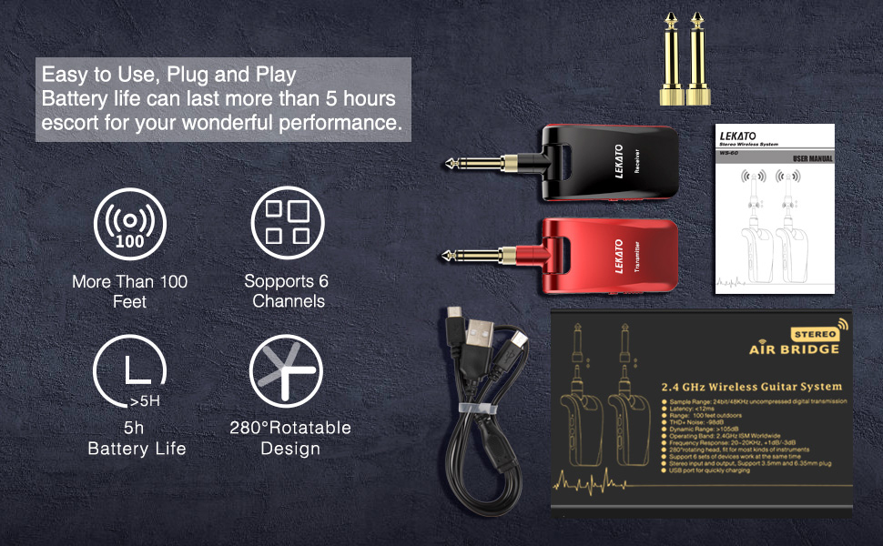 Features: 1. Clear Signal Transmission : Wireless guitar system, 24bit / 48KHz stereo lossless digital transmission sampling rate, <12 ms latency, more than 100 feet effective range, 2.4GHz signal transmission, low latency no signal loss, low noise, professional sound quality. 2. Widespread Use Wireless System: This wireless guitar transmitter and receiver include both 1/8 inch stereo plugs, 1/4 inch stereo plugs, and 1/4 mono plugs in 1 set to support both mono and stereo musical instruments. 6.35mm (1/4 inch)mono plugs for most acoustic-electric guitar, 6.35mm (1/4 inch)and 3.5mm (1/8 inch) stereo plugs for most Audio products such as the camera recording, phones and tablets to edit music. 3. Stereo Sound:Wireless guitar system supports stereo musical passive pickup instruments. Dual channel surround sound, suitable for electronic drum, passive pickup guitar, bass, and other electric acoustic musical instrument, so that music has a sense of hierarchy, sense of space. 4. Plug and Play & Rechargeable : Long press the signal key to match transmitter and receiver at the same time, no other operation is required. 5. Equipped with a rechargeable lithium battery, which supports quick charging for 1.5 hours and can play for up to 5 hours. with double end USB cable package. 6. Six Channel Use Simultaneously : Transmitter and receiver support 6 sets of device work at the same circumstances, one-to-one and no-interference. One transmitter transmit signal to several to several receivers at the same time. 280° Rotating head designed for most musical instruments.