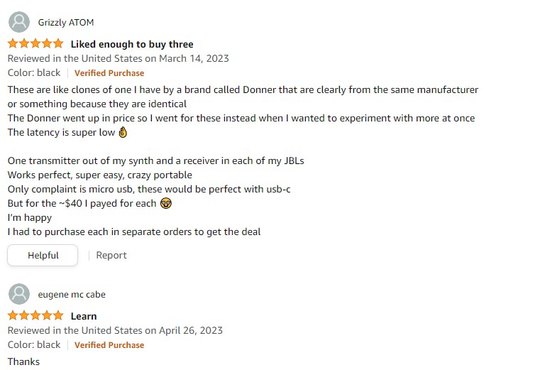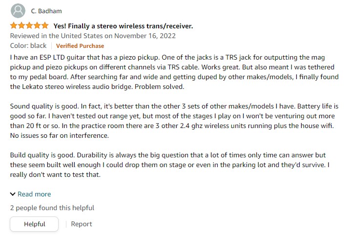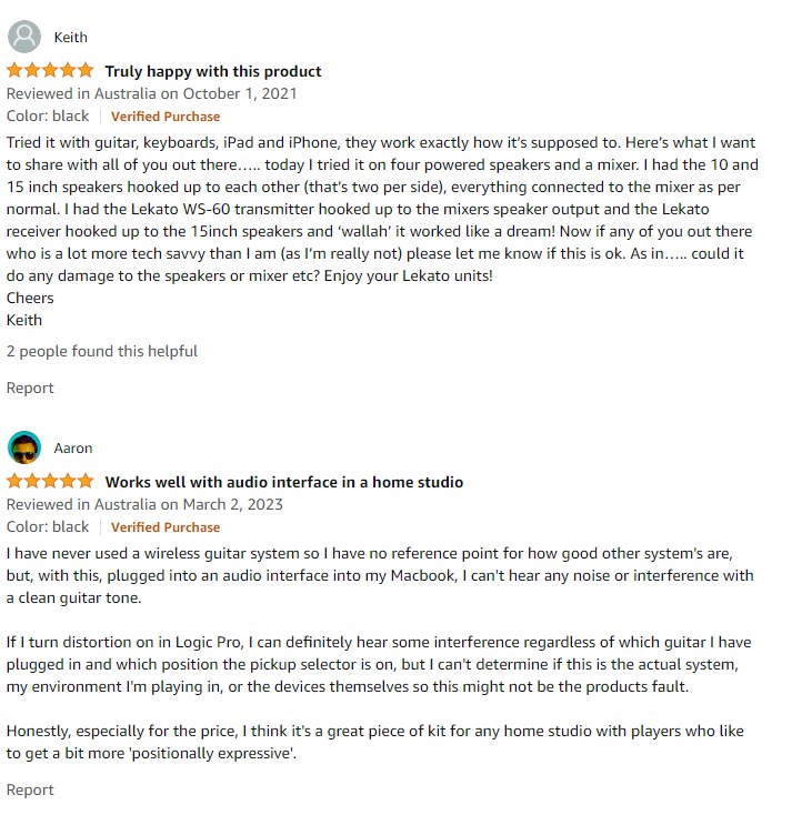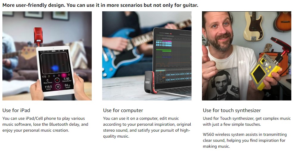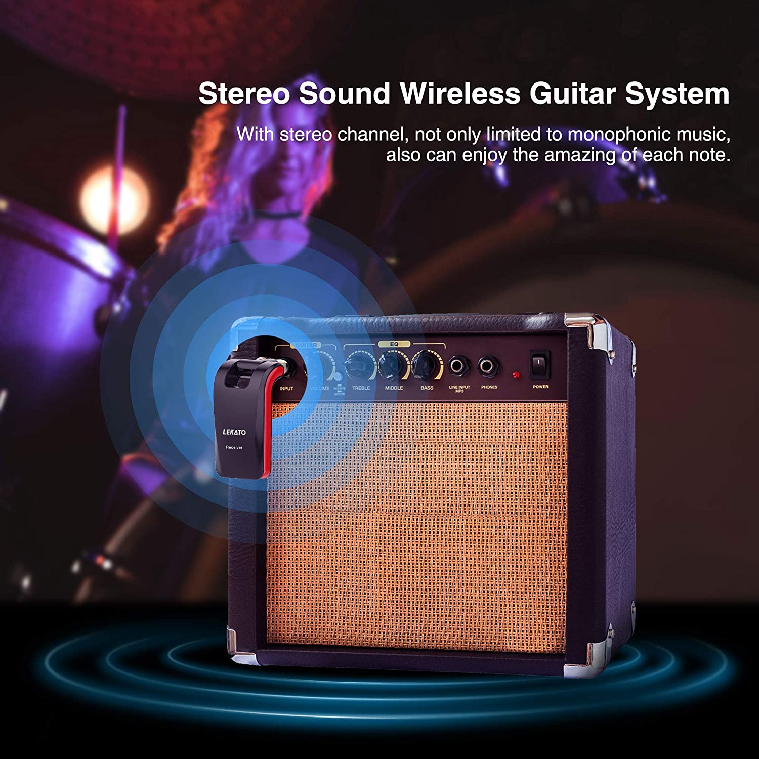 Features: 1. Clear Signal Transmission : Wireless guitar system, 24bit / 48KHz stereo lossless digital transmission sampling rate, <12 ms latency, more than 100 feet effective range, 2.4GHz signal transmission, low latency no signal loss, low noise, professional sound quality. 2. Widespread Use Wireless System: This wireless guitar transmitter and receiver include both 1/8 inch stereo plugs, 1/4 inch stereo plugs, and 1/4 mono plugs in 1 set to support both mono and stereo musical instruments. 6.35mm (1/4 inch)mono plugs for most acoustic-electric guitar, 6.35mm (1/4 inch)and 3.5mm (1/8 inch) stereo plugs for most Audio products such as the camera recording, phones and tablets to edit music. 3. Stereo Sound:Wireless guitar system supports stereo musical passive pickup instruments. Dual channel surround sound, suitable for electronic drum, passive pickup guitar, bass, and other electric acoustic musical instrument, so that music has a sense of hierarchy, sense of space. 4. Plug and Play & Rechargeable : Long press the signal key to match transmitter and receiver at the same time, no other operation is required. 5. Equipped with a rechargeable lithium battery, which supports quick charging for 1.5 hours and can play for up to 5 hours. with double end USB cable package. 6. Six Channel Use Simultaneously : Transmitter and receiver support 6 sets of device work at the same circumstances, one-to-one and no-interference. One transmitter transmit signal to several to several receivers at the same time. 280° Rotating head designed for most musical instruments.