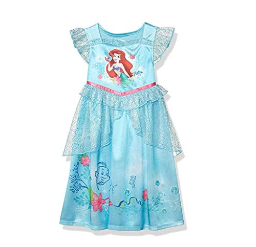 She'll be sure to love the fun and colorful graphics with Ariel and Flounder. Features shimmery flutter sleeves and ruffled collar accent. A satin bodice and skirt in bright blue. The tiered coordinating tulle overlay adds to the charm.