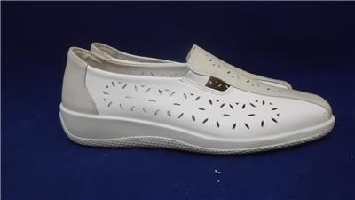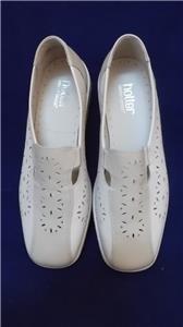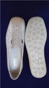 The shoes are beige leather with a punched design and elastic inserts making them easy to slip on.