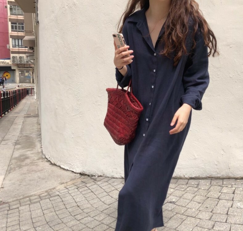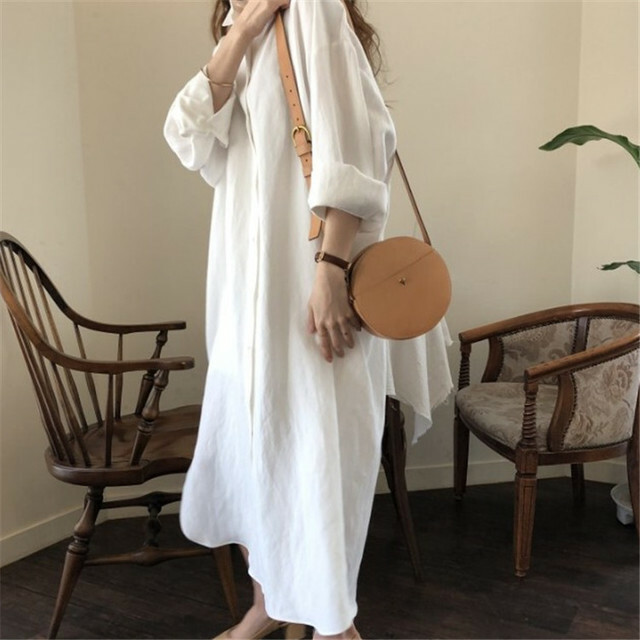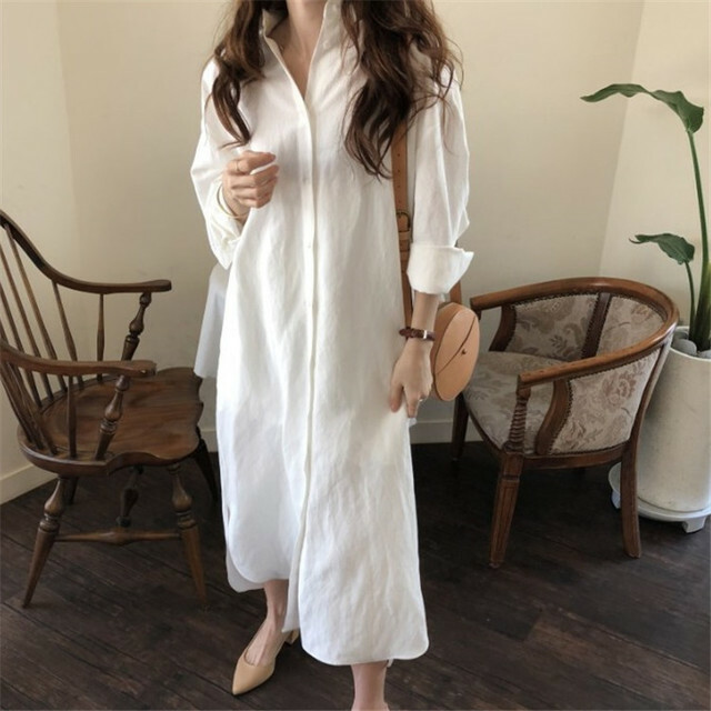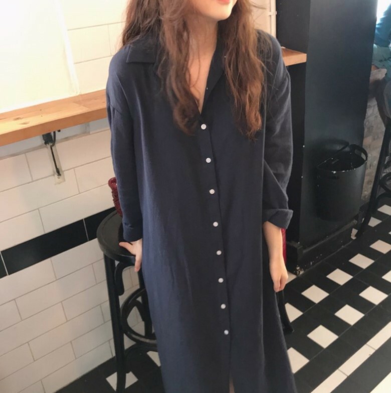 Women's Lapel Shirt Dress Linen Cotton Long Button Dress