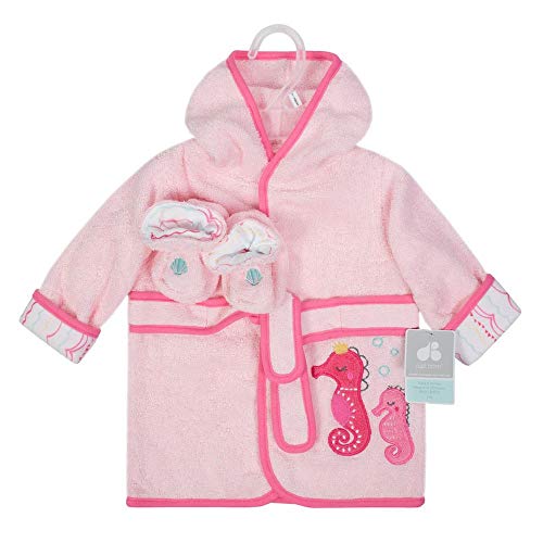 Make bath time fun with this baby boys' robe and booties set. Features a super cute Seahorse theme in soft fabric and colorful embroidery. The soft cotton terry fabric of this robe keeps her dry and comfy, while the cute appliques are sure to make a splash. An attached belt and rolled print cuffs. Of an thick and absorbent terry cotton. Coordinating booties with elasticized cuffs for a custom fit. Hooded for extra warmth and comfort