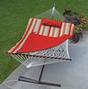 Love to lounge? This hammock is for you! Crafted of natural cotton rope, with hardwood spreader bars and plated hardware Includes 12' powder-coated steel stand Also comes with a weather-resistant polyester cover and pillow with plush poly fiberfill for ultimate outdoor relaxation Assembles in seconds without tools Supports up to 275 lbs. Measures 144"Lx52"Dx45"H