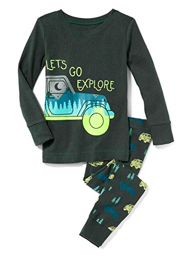 Your little explorer will love the fun adventure theme parts on this soft and cozy pajama set. In deep hunter green with a crew neck style collar and long sleeves. Coordinating pajama pants with black cuffs. An elasticized waistband for a custom fit. Of a soft, 100% cotton, to be worn snug-fitting.