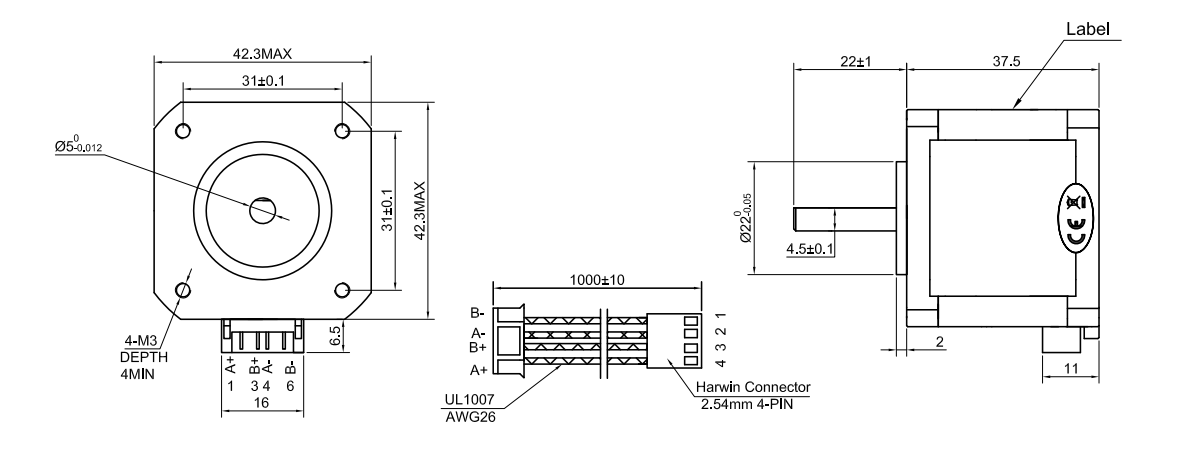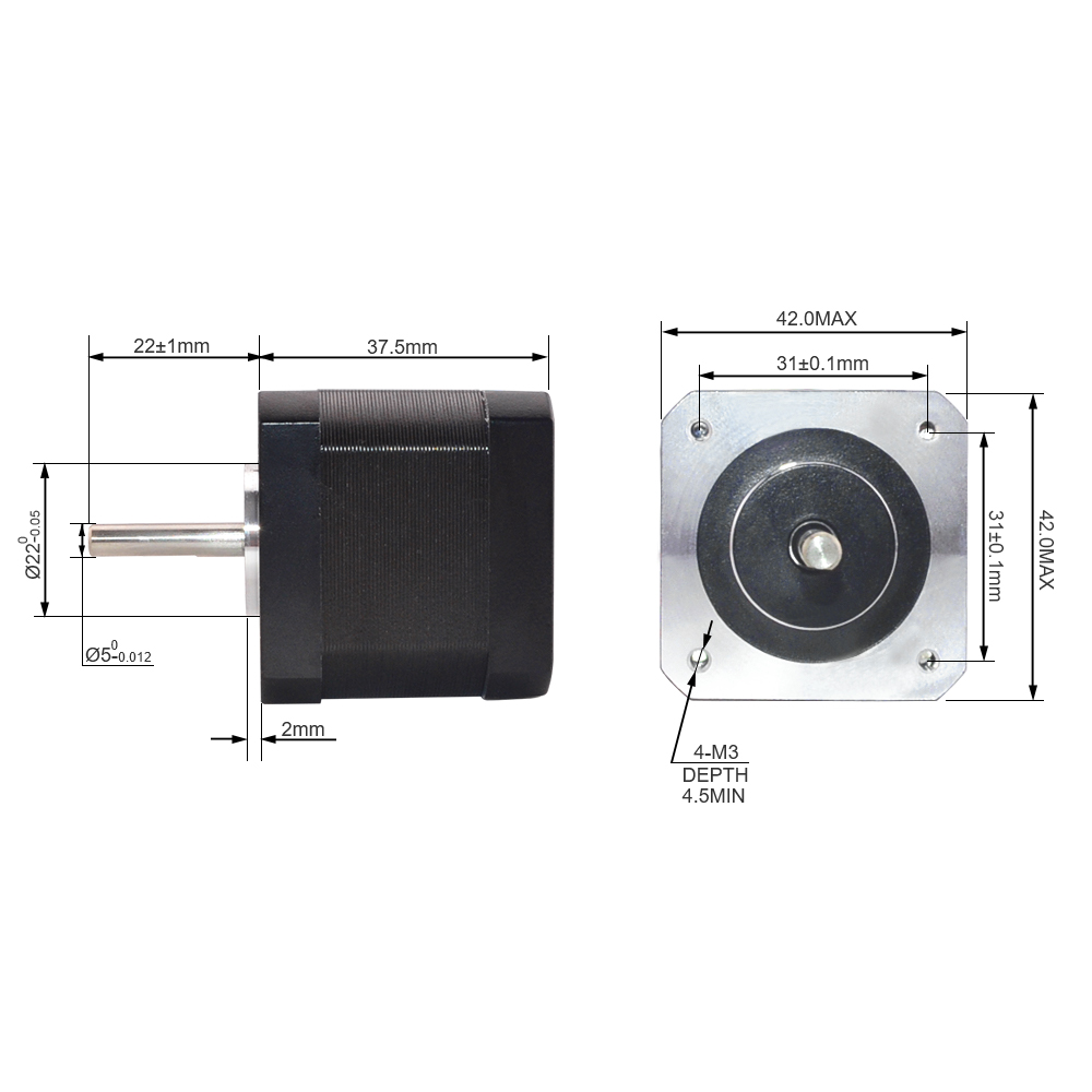 This bipolar Full D-cut shaft Nema 17 stepper motor with step angle 1.8deg and size 42x42x37.5mm. It has 4 wires, each phase draws 1.7A, with holding torque 44Ncm (62.32oz.in).