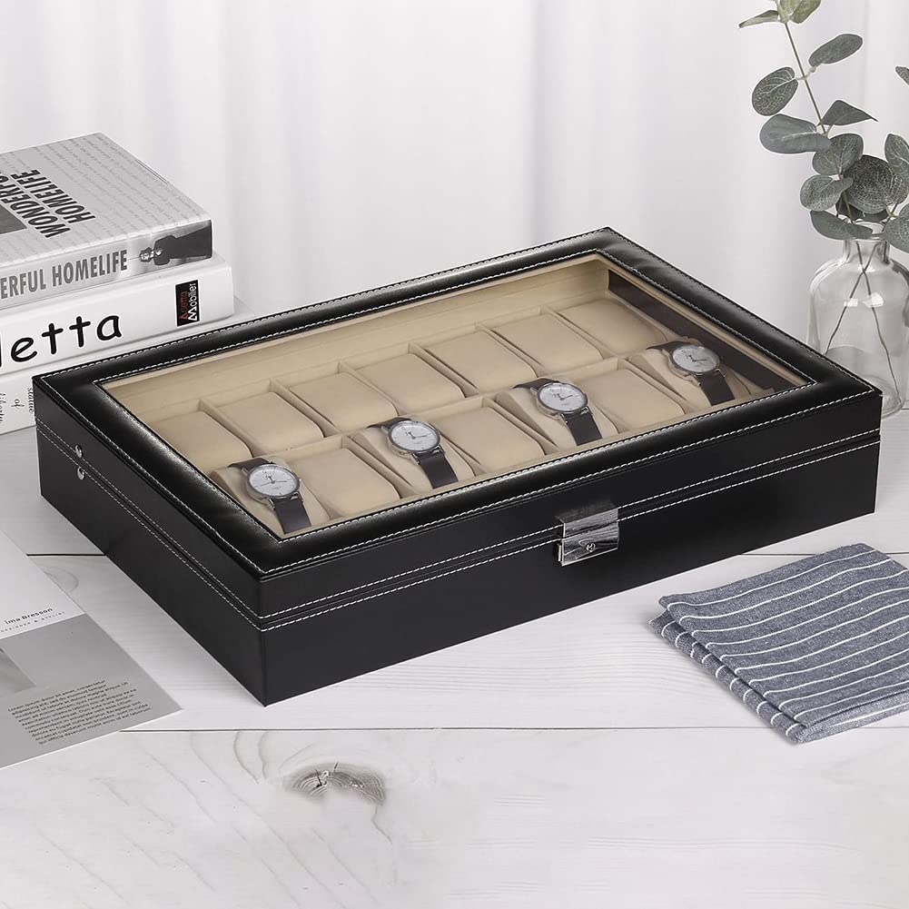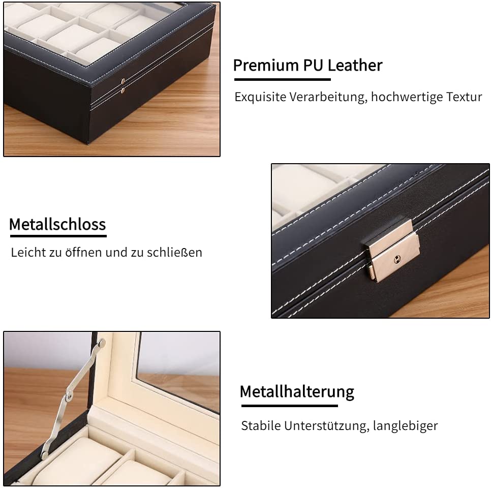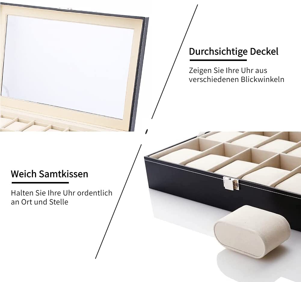 Product Description Große Kapazität: Drei Reihe, die jeweils 8 Sitze, kann insgesamt 24 Uhren aufnehmen, mehr Platz für Sie zu sparen. Neben Uhren, sondern auch Aufnahme von Ohrringe, Ringe, Halsketten, Armbänder und anderen Schmuck, multifunktionale, bequemer. Erstklassige Materialien: Mitteldichte Faserplatte mit MDF, innen mit Beflocken, außen mit Kunstleder, Sichtfenster mit Glas. Das Präsentationsfenster aus Glas präsentiert Ideal Ihre Lieblingsuhren und Ihre edlen Geschmack. Stilvolles Design: Innen mit Samt hellstellt, weichen und feuchtigkeitsbeständig, spezielle kleines Kissen für Uhren, nicht leicht verformt, Metallschnalle mit Galvanotechnik, Rostschutz, sicher, langlebig, Hervorhebung der Extravaganz, die Hand-Car-Linie, schön und haltbar. Zuverlässige Sicherheit: Sehen Sie außerhalb der Box mit feinen Schlössern, nur mit dem Schlüssel zu öffnen, verantwortlich für die Sicherheit Ihrer Uhren, die beste Sicherheit zu bieten. Glasfenster: Einfach zu reinigen, und keinen Kratzer. Der Rahmen: Sie besitzt einen schwarzen Kunstlederbezug mit weißen Kontrastnähten. Optimaler Schutz dank verschließbarem Schnappschloss inklusive 1 Schlüssel.