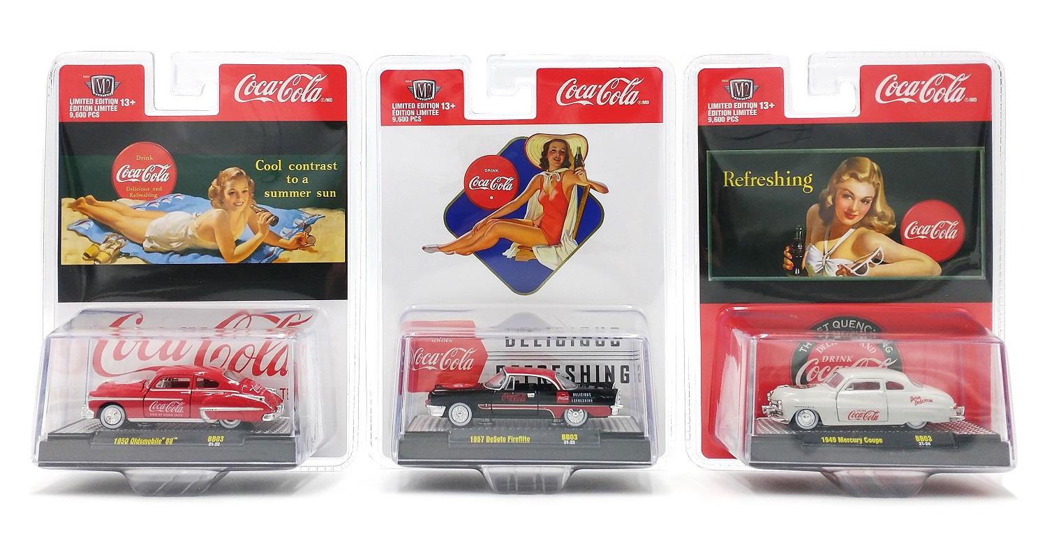 M2 Machines 1:64 Scale Coca-Cola Bathing Beauties Release BB03 Diecast Vehicles. Three models to choose from; 1950 Oldsmobile 88, 1957 DeSoto Fireflite, 1949 Mercury Coupe or collect all three!