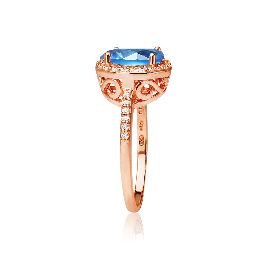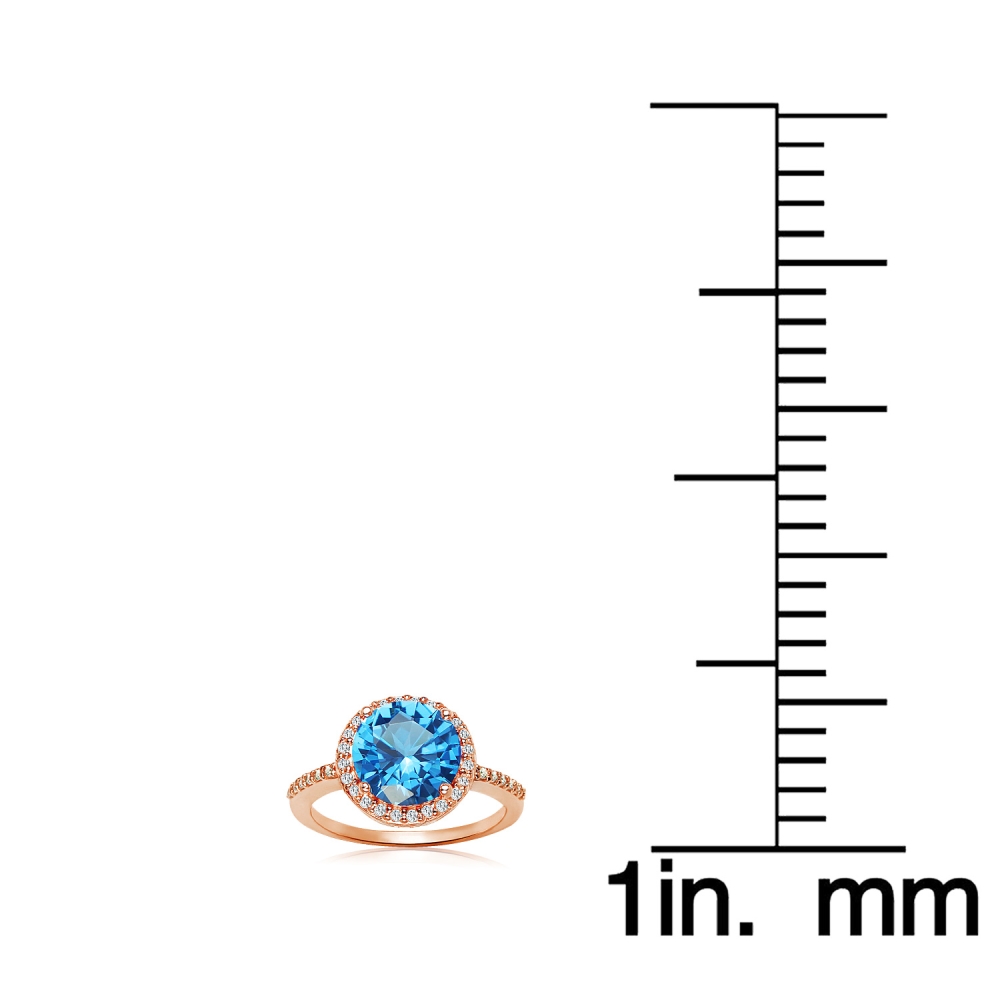 | This gleaming ring will dress up and brighten any attire. The simulated blue topaz gemstone transforms into a brilliant jewel surrounded by a halo of cubic zirconia stones that extend up the sides of the rose gold flashed sterling silver ring. RRG13884NBT-5 |