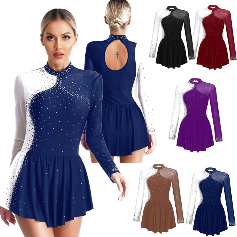 Women Shiny Rhinestone Dance Dress See-through Mesh Patchwork Figure Skating Costume.