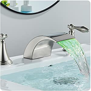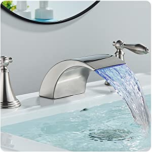 Bathroom black waterfall faucet 3 hole with layered water and LED lights, presenting you with a perfect visual enjoyment.