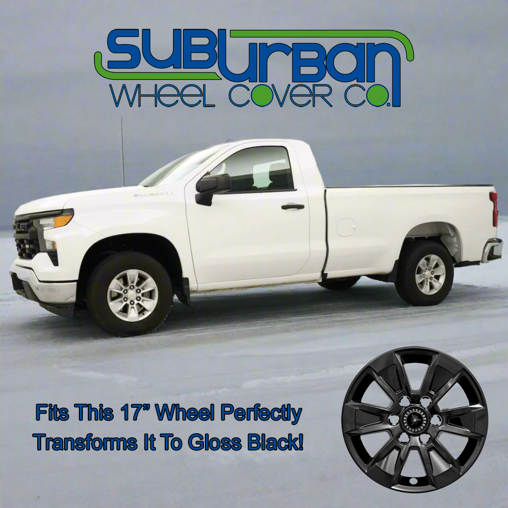 This listing is for a brand new set of gloss black wheel skins for 2019-2026 Chevrolet Silverado LT 1500 models with the standard 17" 6 spoke aluminum wheels only. They will not fit any other wheel.