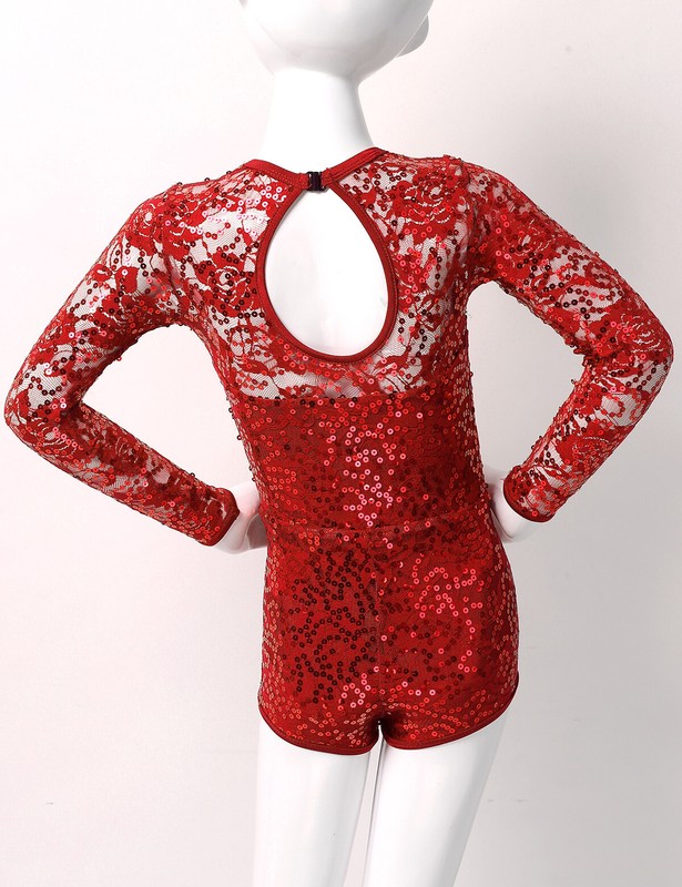 Spandex biketard covered with shiny sequins lace overlay. With lining for comfy wearing. Sparkling dancewear for your girl.