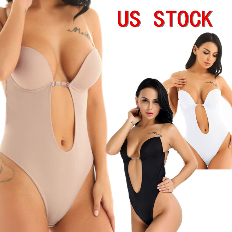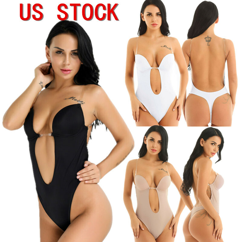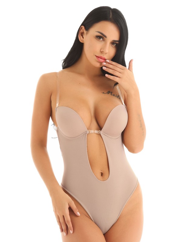 Low plunging V-neck, backless, clear shoulder straps with 3 hooks from two sides of the bodysuit for straps adjusted.