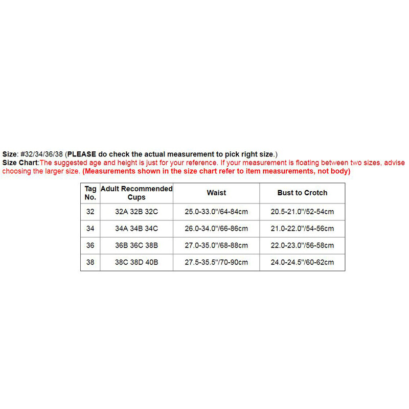 Tag No.Adult Recommended CupsWaistBust to Crotch3232A 32B 32C25.0-33.0"/64-84cm20.5-21.0"/52-54cm3434A 34B 34C26.0-34.0"/66-86cm21.0-22.0"/54-56cm3636B 36C 38B27.0-35.0"/68-88cm22.0-23.0"/56-58cm3838C 38D 40B27.5-35.5"/70-90cm24.0-24.5"/60-62cmFriendly Tips: The size is measured by hands, please allow minor error of measurement. Photo color might be a little different from the actual product due to color display of different monitors.