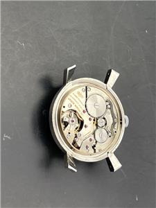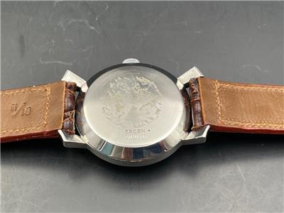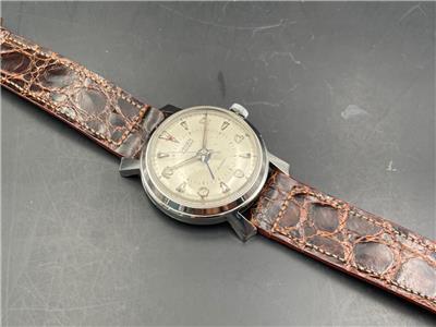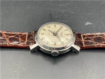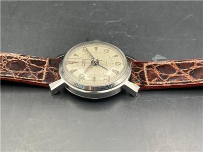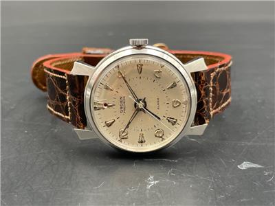 COMMENTS: VERY COOL AND HARD TO FIND ONE BUTTON GRUEN 910SS ALARM WATCH. THE WATCH SHOWS VERY MINIMAL SIGN OF USAGE AND IS IN VERY GOOD SHAPE. IT FUNCTIONS PERFECTLY AND KEEPS PROPER TIME. THE ALARM IS CHARMING LOUD . THE SOLID ALL STAINLESS STEEL CASE IS IN EXCELLENT SHAPE. THE ORIGINAL UNTOUCHED SILVER DISPLAYS PATINAS AND AGES. THE MOVEMENT IS VERY CLEAN AND HAS BEEN SERVICED RECENTLY.