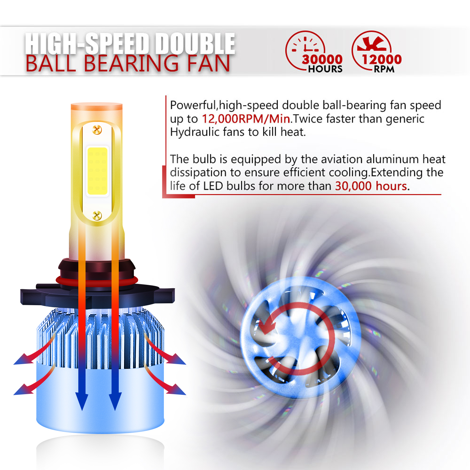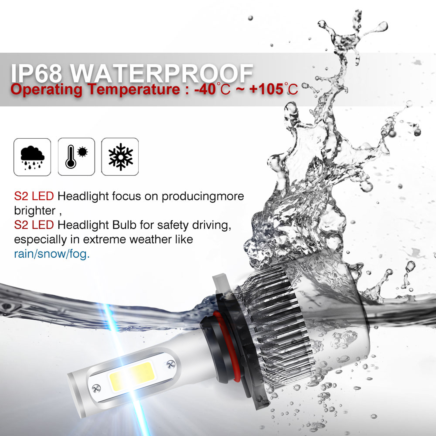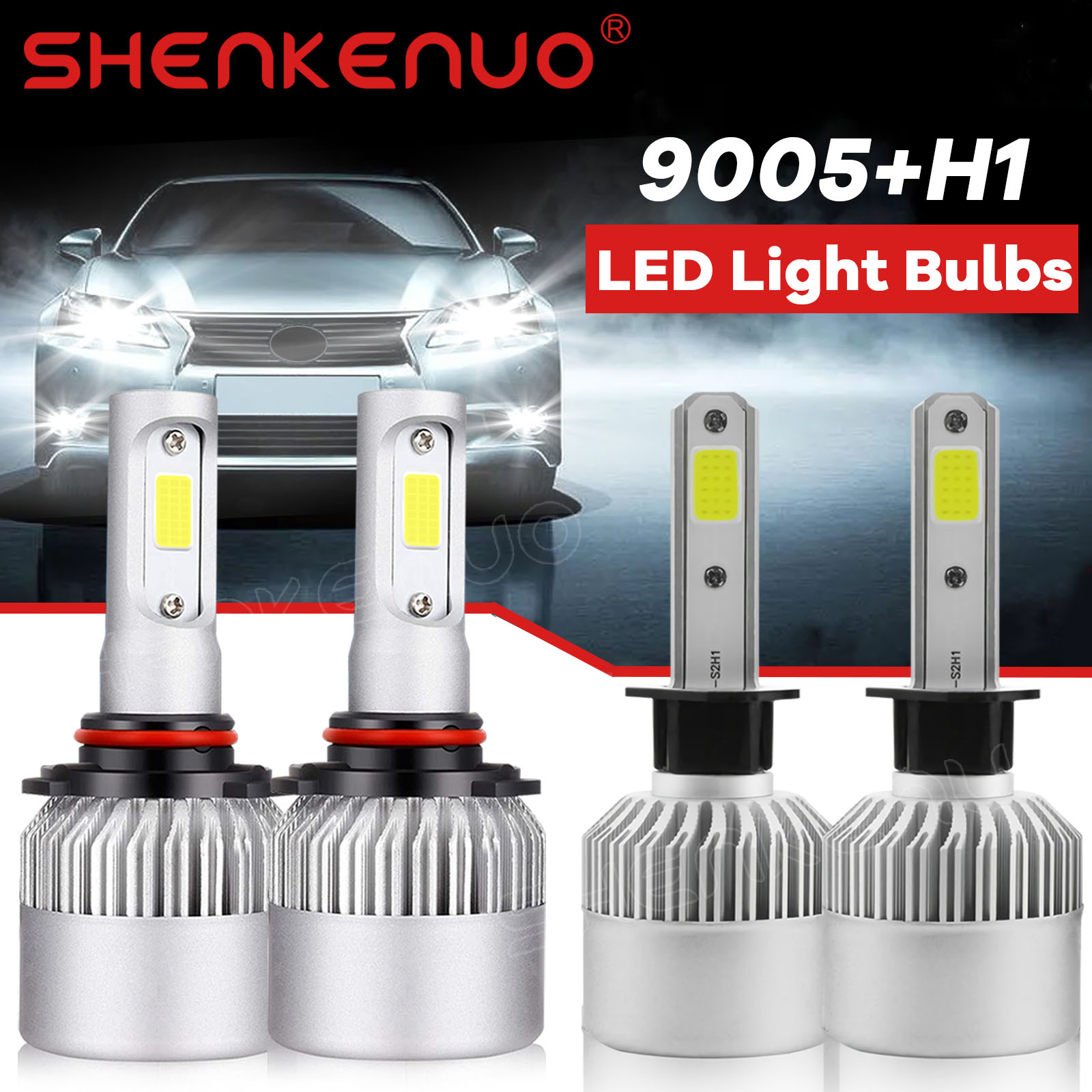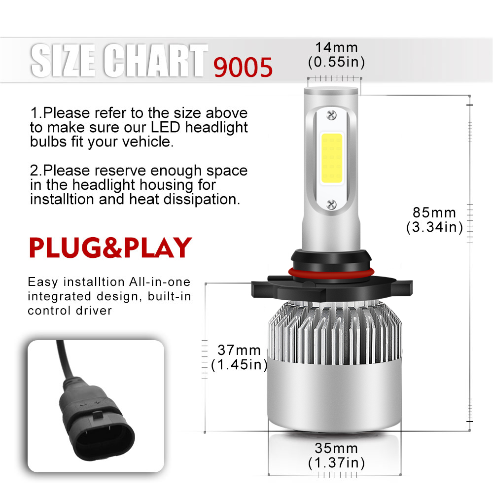 Features: 1.9005 (headlight) + H1 (Low Beam) 2.Built-in Fans & Ballasts , No Other Fans & Ballasts Required 3.Beam Angel: 360 Degrees 4.Color Temperature: 6000K White 5.Built-In Cooling Fans ,Smart Efficient Cooling System Fast Heat Dissipation 6.High quality Aluminum heat dissipation ensures the secure temperature range 7.Low Power Consumption than Halogen bulb, Energy Saving 8.Low Voltage Protection, High Precision Constant Current driver Chip 9.Shakeproof and Long lasting up to 50,000 Hours. 10.Easy installation 11.Operating Temperature: -40°C ~ +80°C Specifications: 1.To Fit: High Beam / Low Beam 2. Voltage: DC 9-32V ( Fit 12V,24V Vehicle ) 3. IP Rate: IP68 4. LED type: COB LEDs 5. Beam Angle: 360° 6. Color Temperature: 6000K-6500K White 7. Heat Dissipation Theory: Heat Pipe Technology + A380 Aluminum Heatsink 8. Operating Life: >50000hrs 9. Operating Temperature: -40 - +80°C 10. Number of Bulbs: 6 11. Placement on Vehicle: Left,Right,Front 12. For a few newest years make cars(About 0.1%) ,Germany Cars,Dodge ,Jeep,Toyota,Nissan,Ford,Chevy Cars and DRL Model may need add Load Resistors(Not including) to stop flickering Issue or fix error message Package Include: 2x 9005 LED Headlight High Beam Bulbs 2x H1 LED Headlight Low Beam Bulbs |