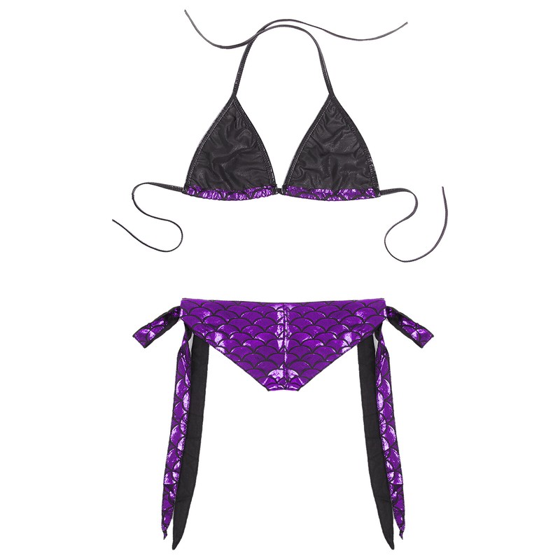 Womens Metallic Shiny Fish Scale Printing Bikini Suit Swimwear Clubwear Lace-up Bra with Briefs.