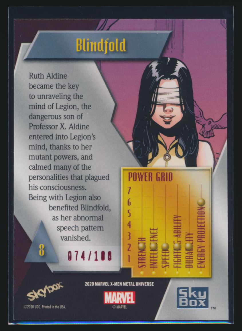 | 2020 Marvel X-Men Metal Universe Precious Metal Gems Red Upper Deck 074/100 8 Blindfold |