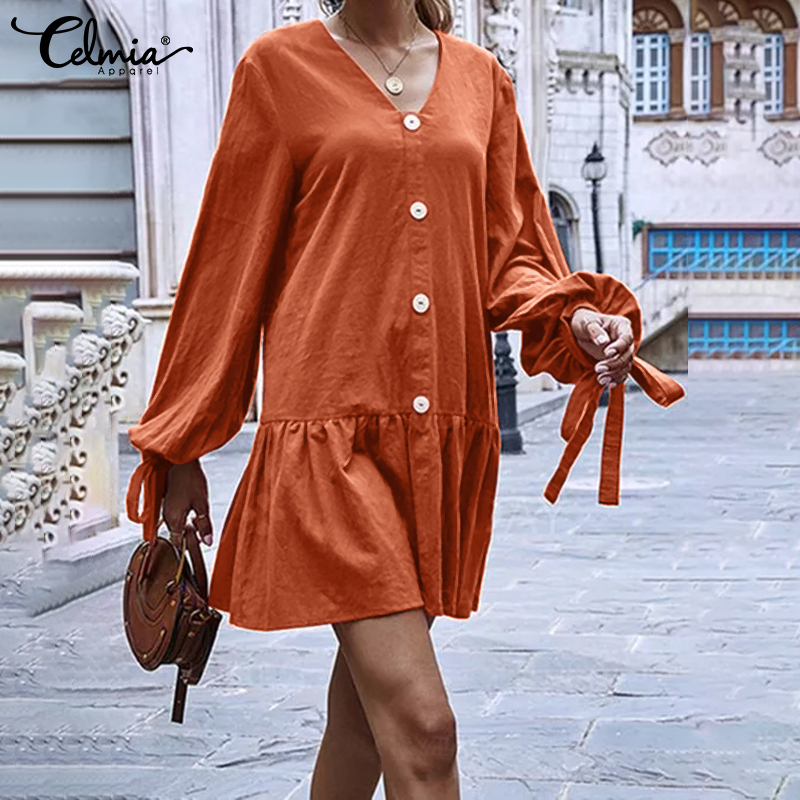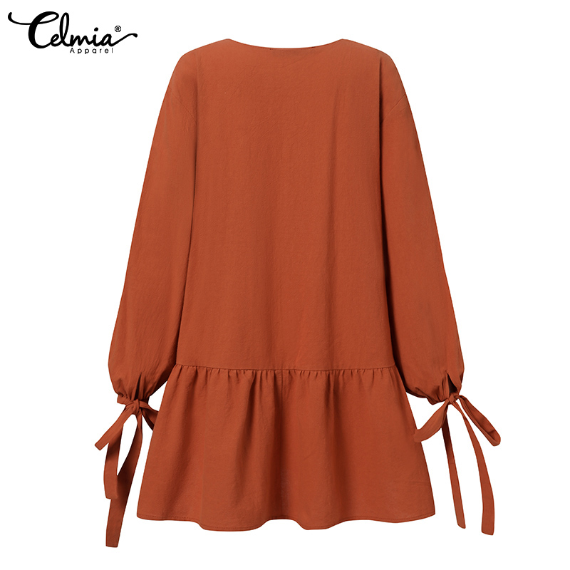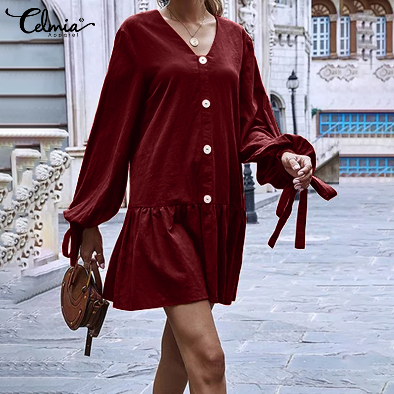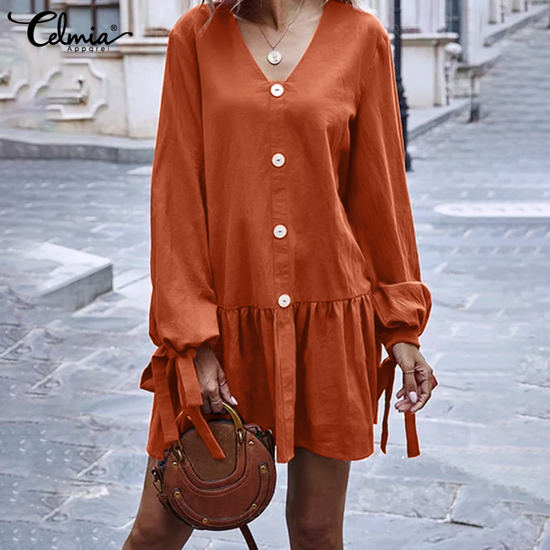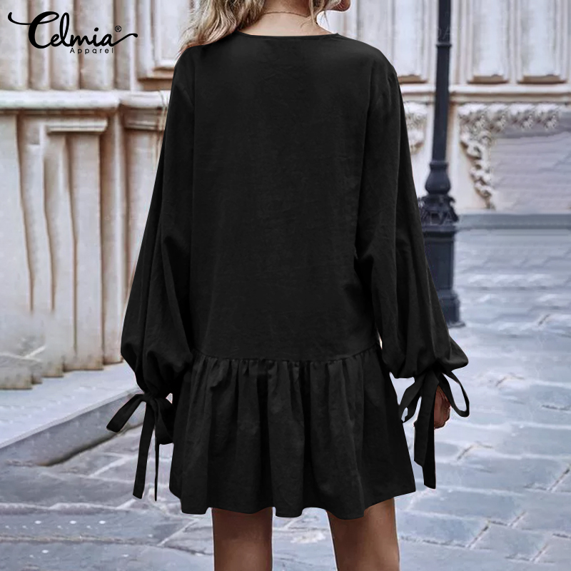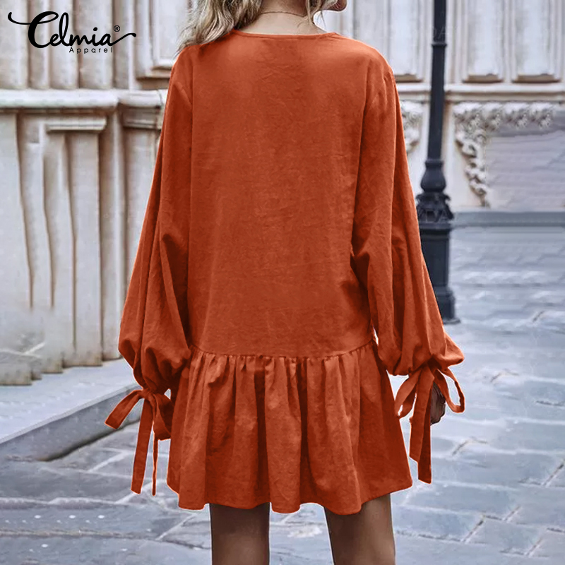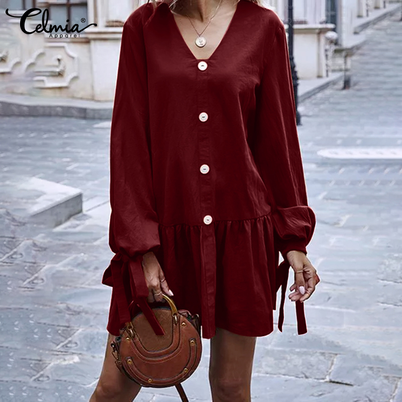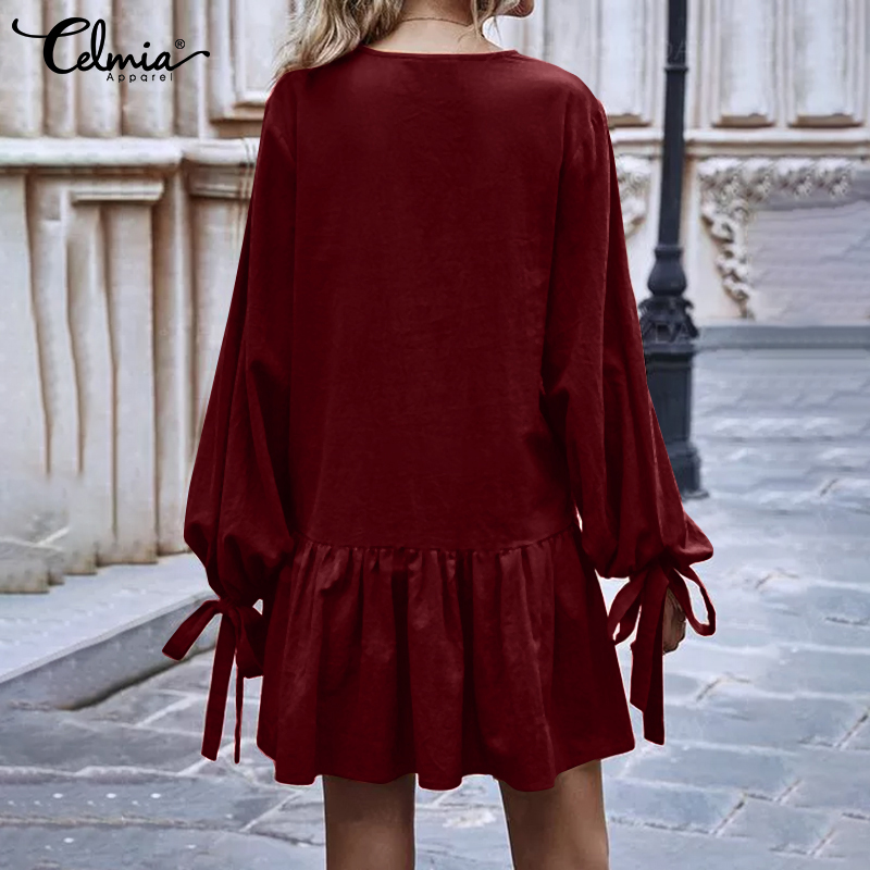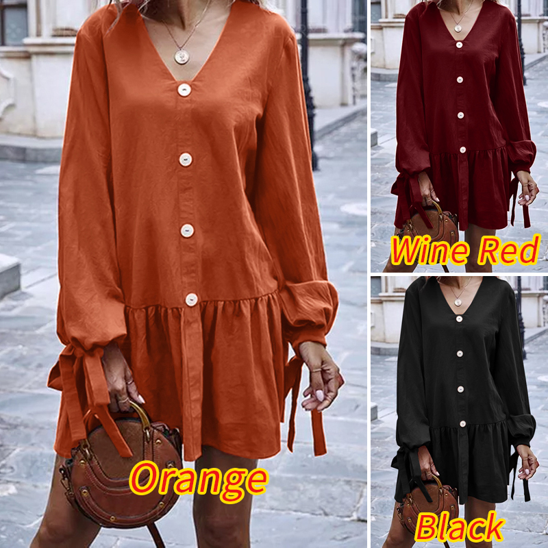 -Features:European and American fashion casual v-neck long sleeves cuffs tie design skirt lotus leaf stitching short dress