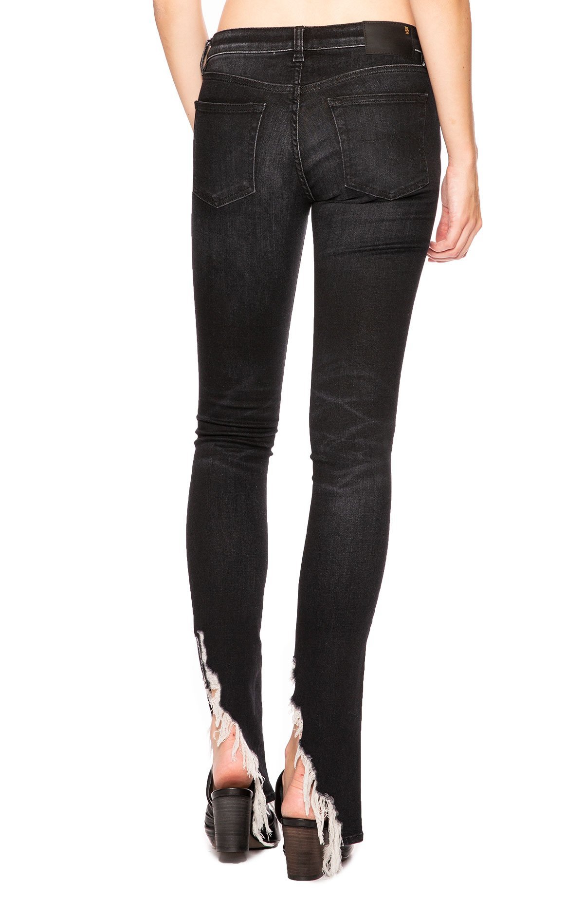 Low rise skinny ankle length jean in dark blue wash with angled fray hem. Signature top-stitched detailing at front waistband and back pocket. Standard zip fly with button closure.
