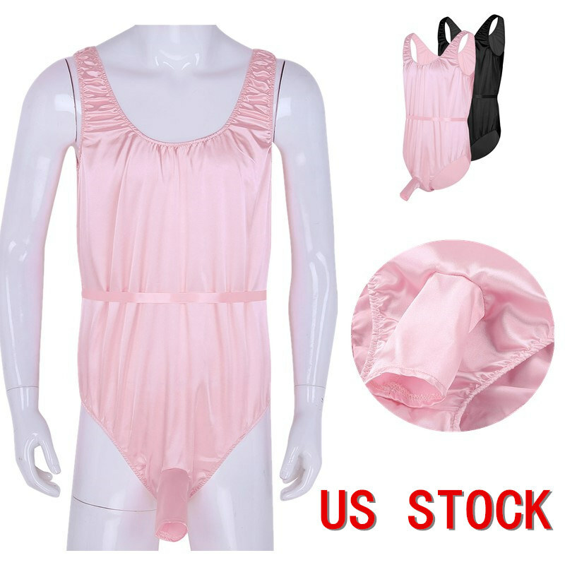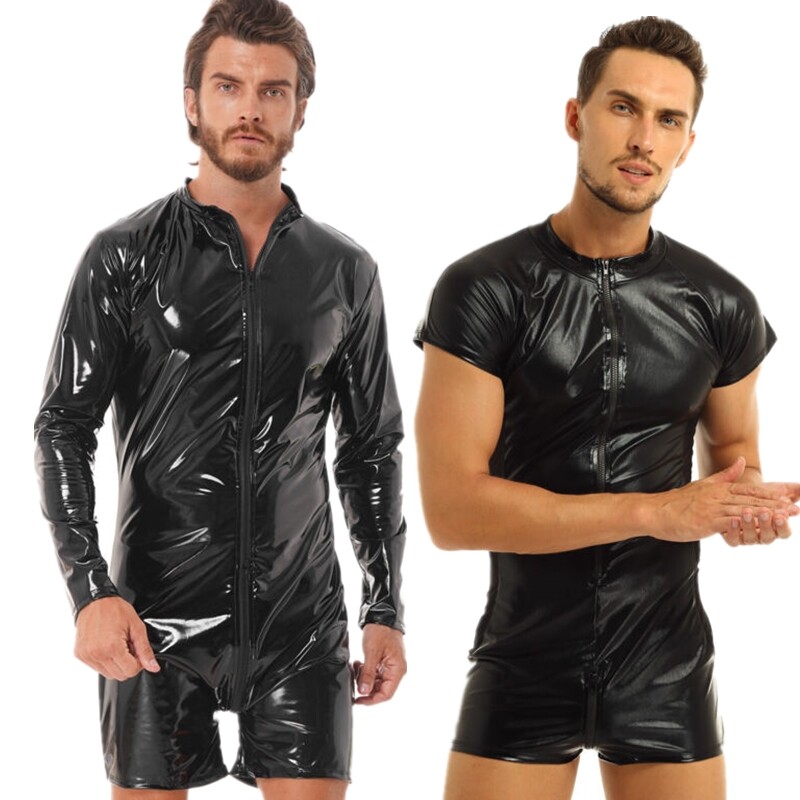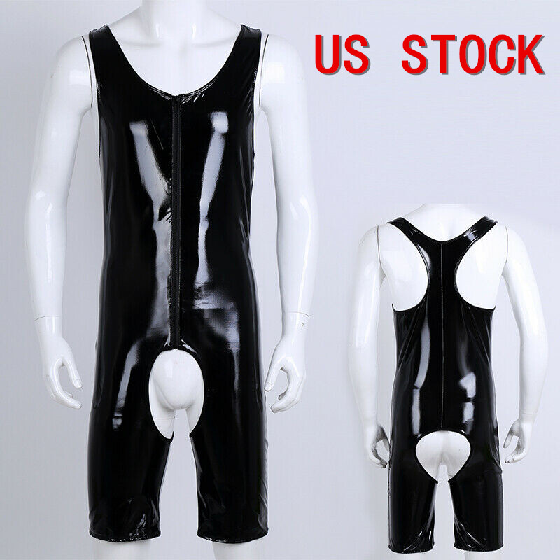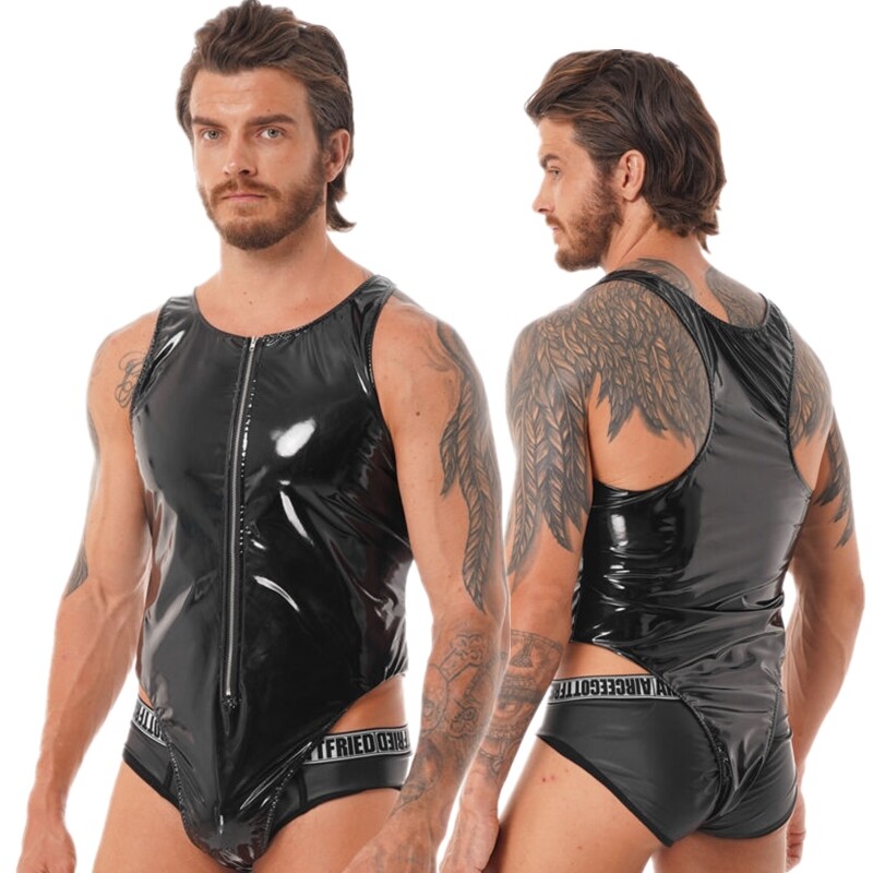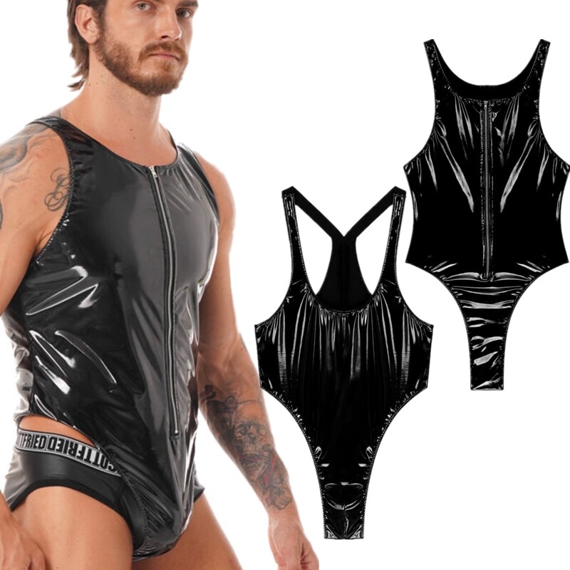 Mens U Neck Sleeveless One-piece Bodysuit Swimwear Patent Leather Zipper Leotard.