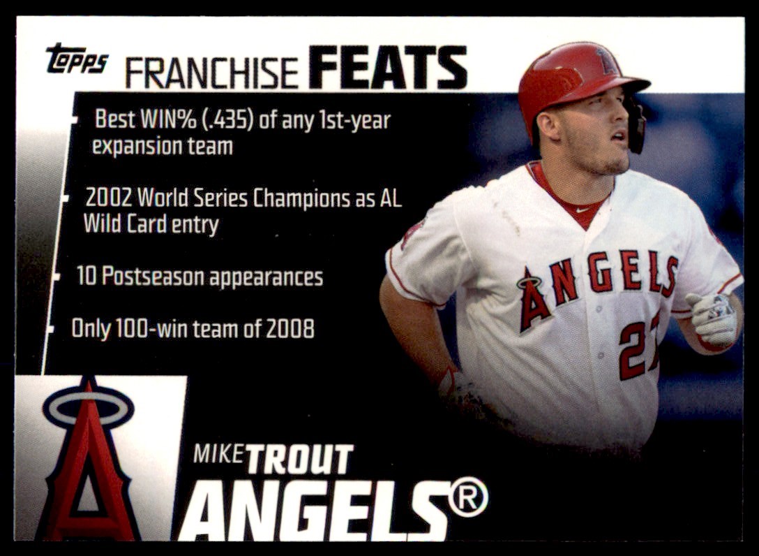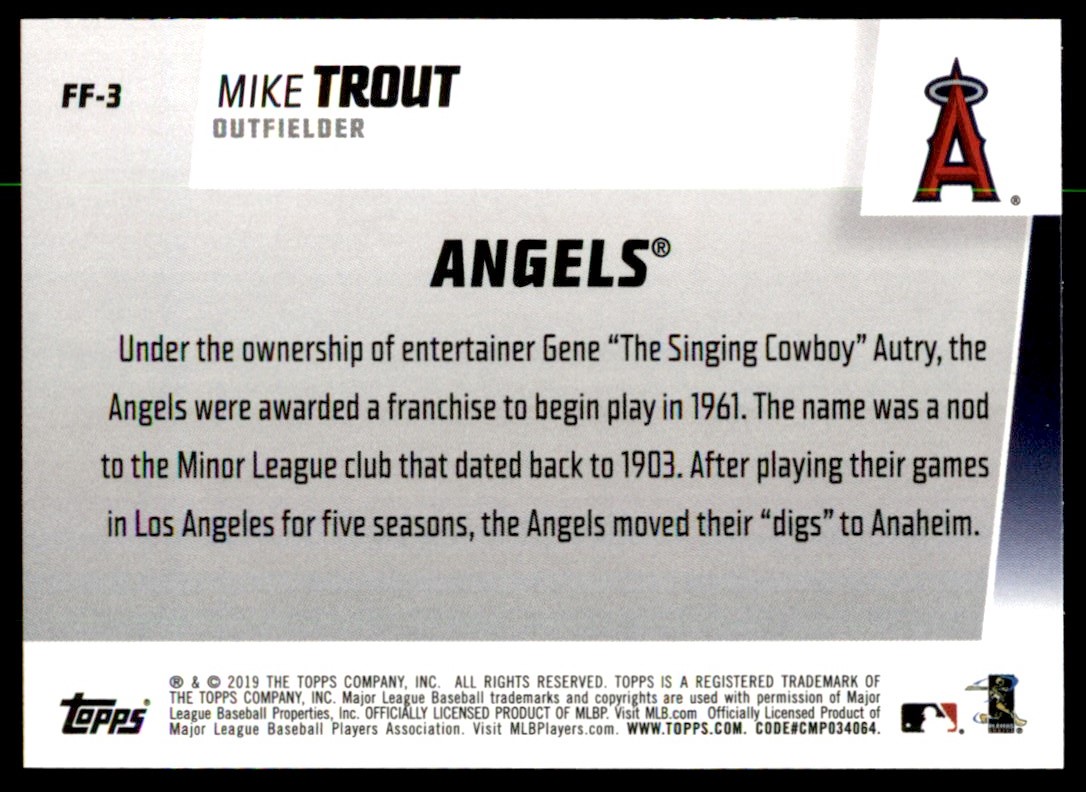 | Description: | Mike Trout | | Category: | Baseball | | Year: | 2019 | | Product: | Topps Franchise Feats | | Team: | Los Angeles Angels | | Card Number: | FF-3 | | Dimensions: | 3½" x 2½" |