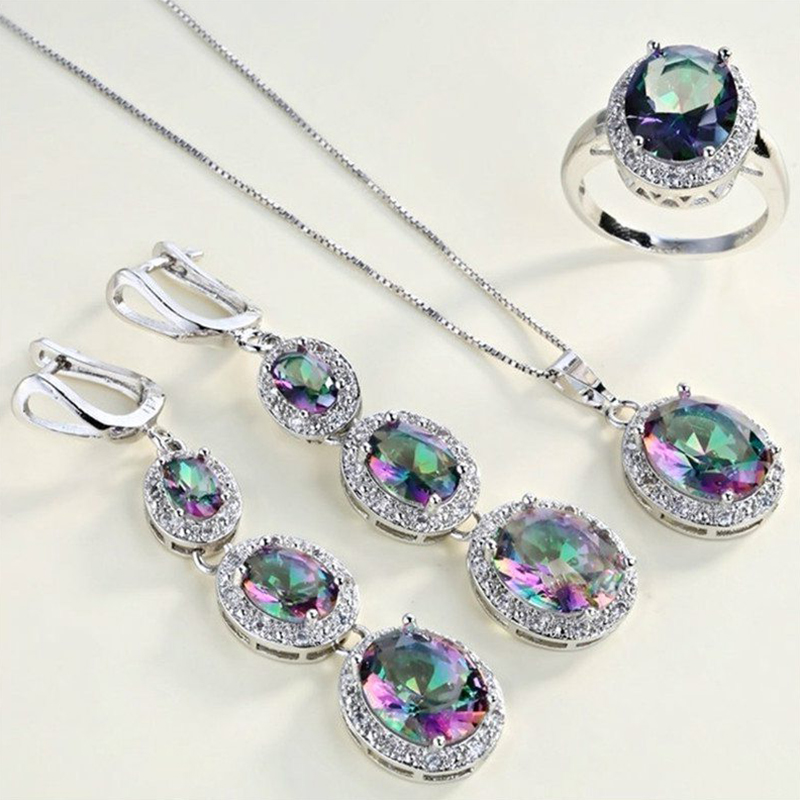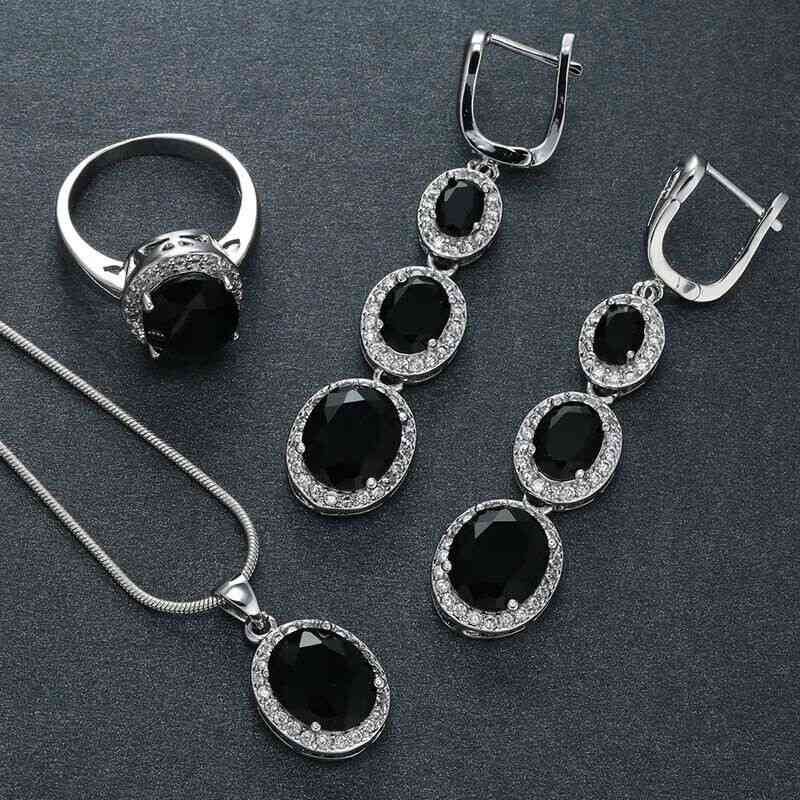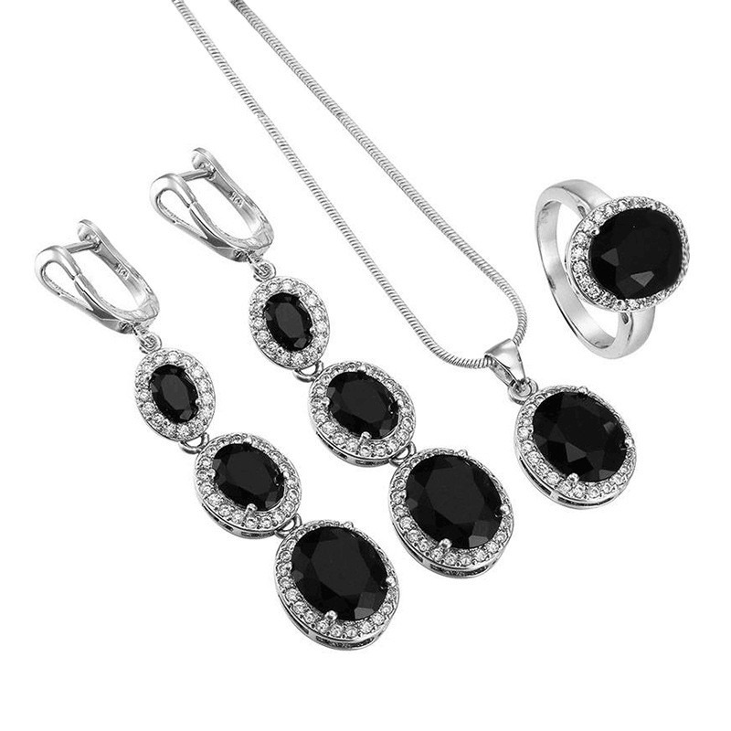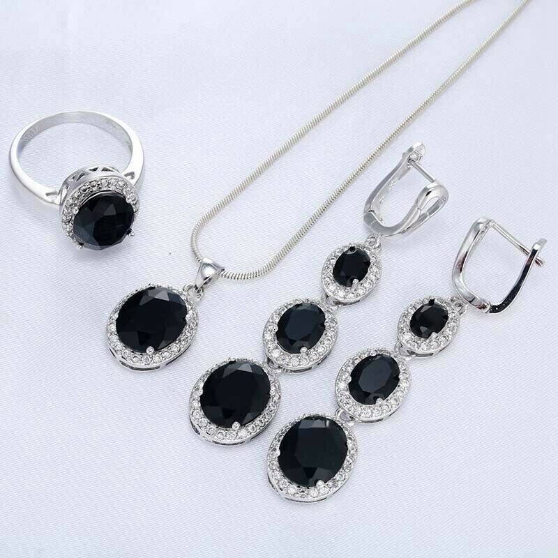 Wedding Silver Jewelry Set Black Zircon 3 Piece Necklace Ring Dangle Earring