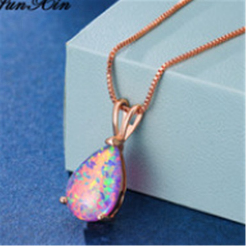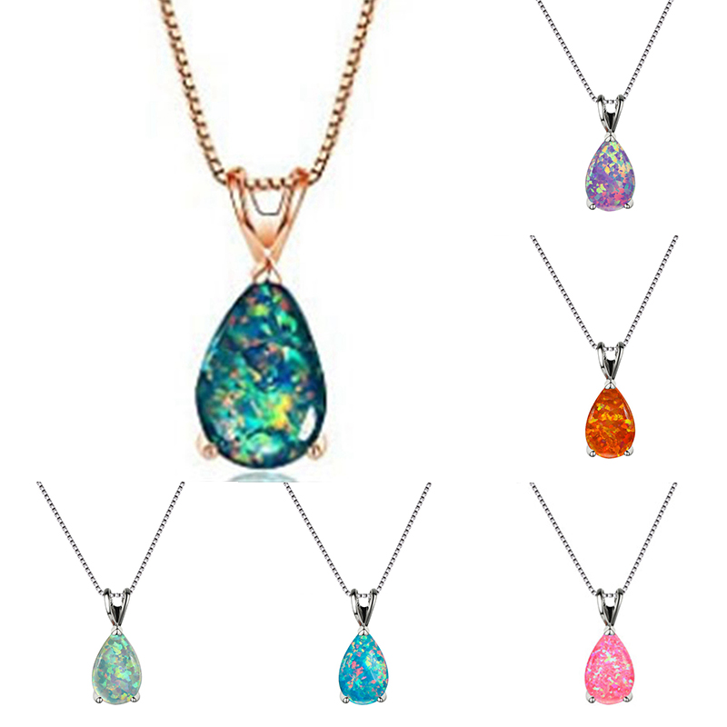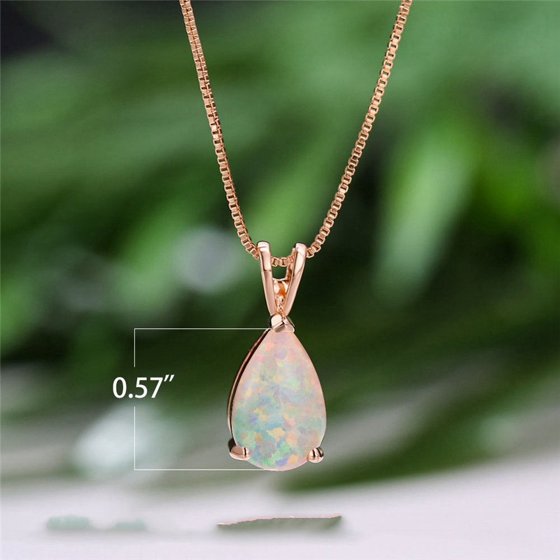 Rose Gold Plated Water Drop White Fire Opal Necklace Such beautiful Green & Pink fire from this opal necklace, it's hard to capture its lovely flashes properly in still photos! The gem is a created Opal and measures 14mm x 8mm - the entire pendant measures 20mm x 8mm. The setting is Rose Gold Plated - beautifully made and just ornate enough to make the necklace thoroughly unique and unforgettable. The necklace comes with a Rose Gold box chain in a standard 18-inch length. Opal is a stone of inspiration which enhances imagination and creativity. It can bring inspiration to projects and to life and Spirit. Its own spirit is at times like that of a child spontaneously playing, dashing color where ever it pleases. Carrying this imaginative spontaneity into the realm of you life can bring strong creativity.
