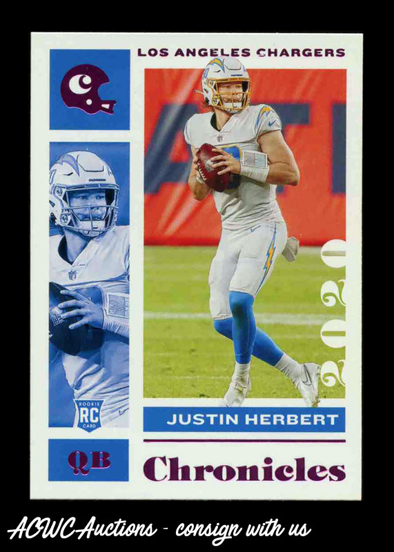 2020 Panini Chronicles Pink Foil #53 Justin Herbert RC (San Diego Chargers) - This card is not graded; but in our opinion in NM or better. Ungraded cards are placed in a card sleeve then top-loader and shipped in an envelope.