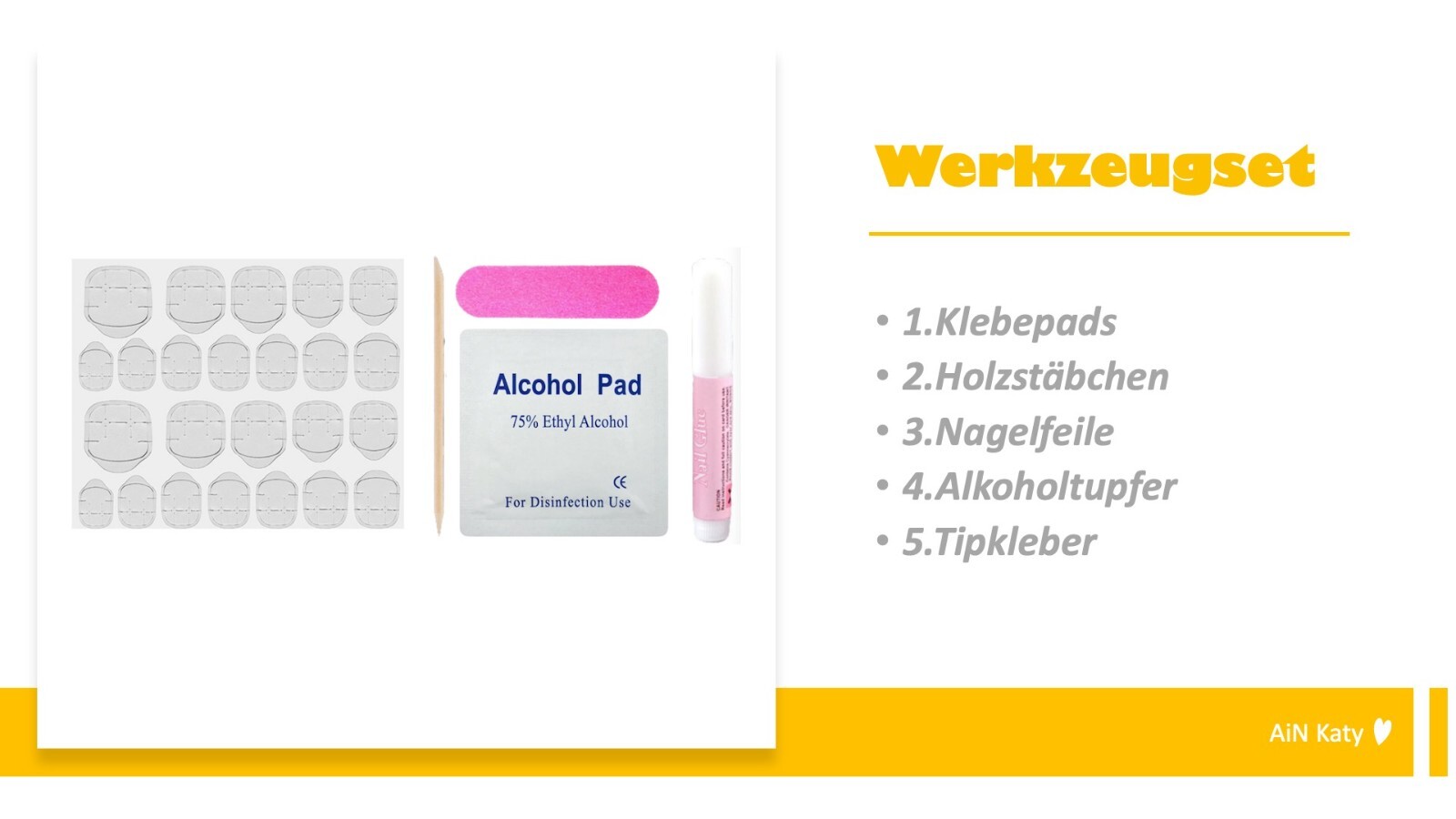 - Reinigung: Nutze die im Set beigelegte Zellette, um deine natürlichen Nägel zu säubern. Somit sitzen Deine AiN Katy Tipps langfristig und fest.