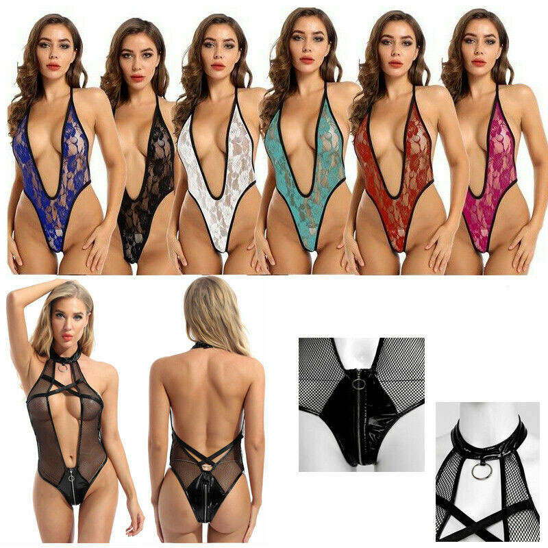 Womens Patent Leather Cutout Bodysuit Short Sleeve Zipper Catsuit.