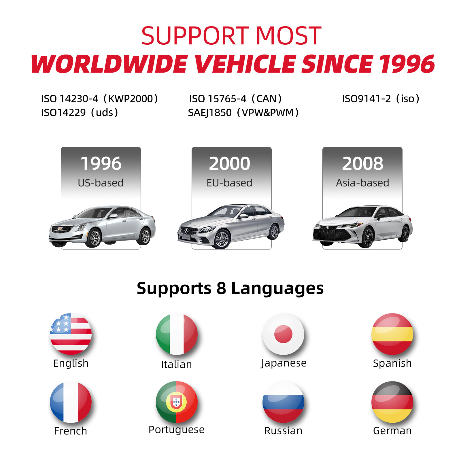 THINKOBD 100 is compatible with most American, European, and Asian models manufactured as from 1996. It supports all OBDII protocols: KWP2000, ISO9141, J1850 VPW, J1850 PWM and CAN (Controller Area Network).