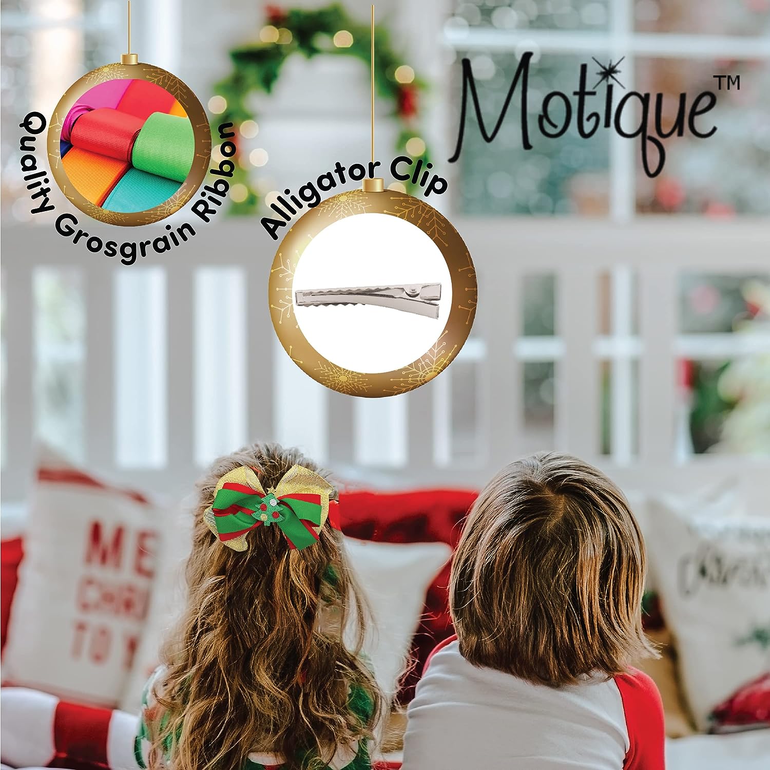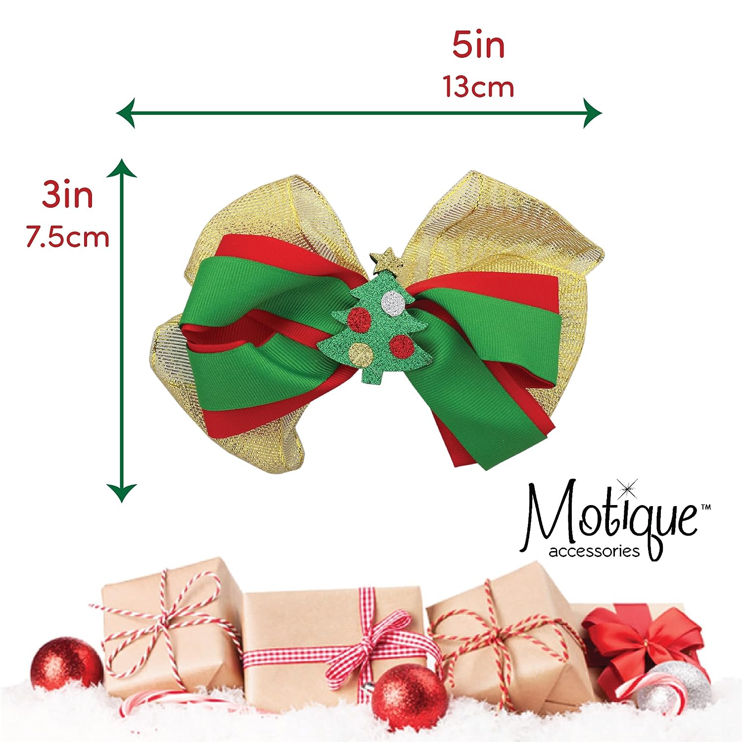 Enhance your holiday season this year with these adorable hair clips.Bow measures approximately 5.5 inches. Alligator clip measures 3 inches. Quality Grosgrain Ribbon. Sturdy Alligator Clip. Will stay in place all day. Perfect for the Holidays. Get in the holiday spirit with our Christmas Themed hair bows.Our bows are made with quality grosgrain ribbon, glitter and tinsel overlays, and silicone Christmas themed charms sure to delight.Durable alligator clip is easy and light to wear, keeping your hair neat the whole day.