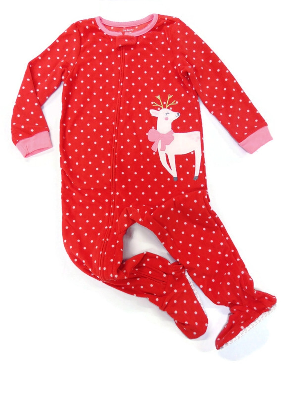 Your little one will be all ready for Christmas in this pretty red polka dot reindeer themed blanket sleeper!