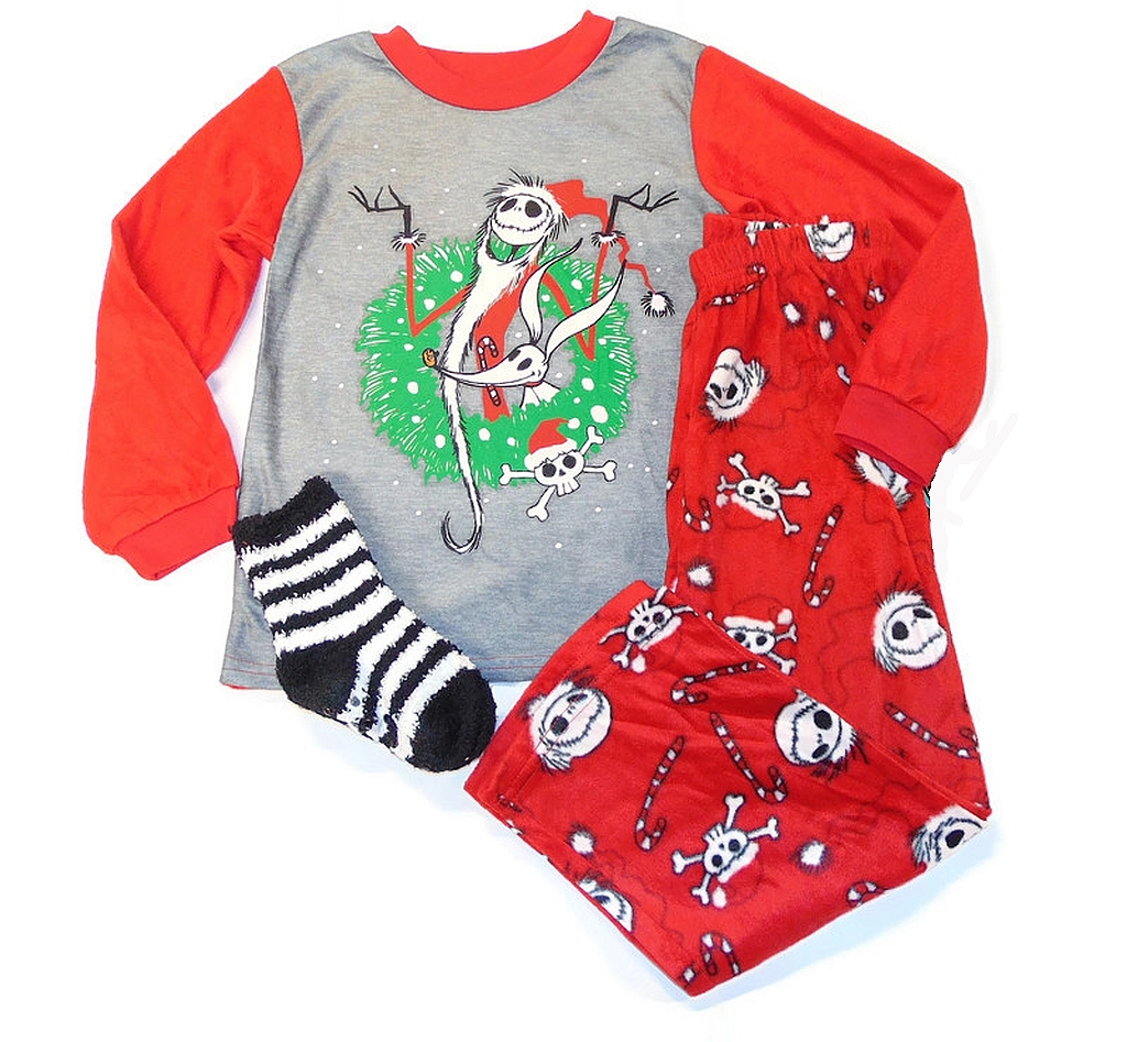 Even the patron saint of Halloween, Jack Skellington, loves Christmas and it's apparent on this fun holiday-themed pajama set. Features Jack and Zero showcased by a festive spooky Christmas wreath. The pajama pants have a Santa Jack-themed print throughout with an elasticized waistband for a custom fit. Constructed of an ultra-soft and plush fleece fabric with matching socks to complete the set. 100% Polyester