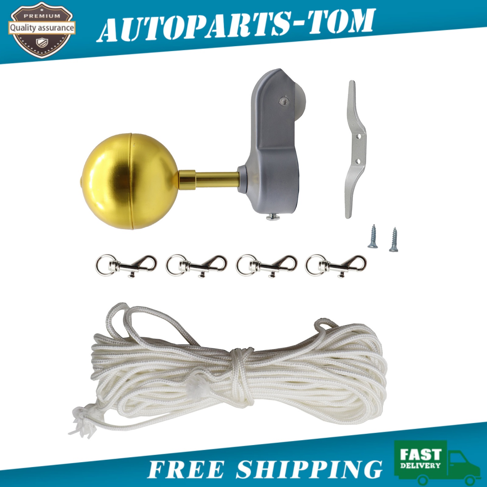 Flag Pole Hardware Parts Repair Kits, 50 Feet Halyard Rope + 3" Gold Ball + 4" Alloy Cleat + 4pcs Metal Hook Clips + Flagpole Truck for 2" Top