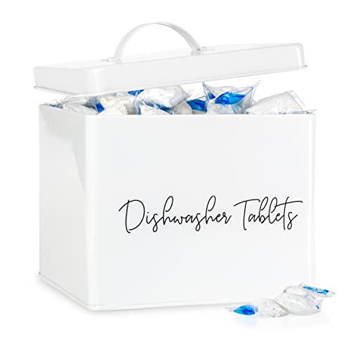 RUSTIC STYLE - Our vintage farmhouse metal container adds the perfect country style accent to your kitchen.STORAGE CONTAINER - Get rid of your bulky plastic store containers and store your dishwasher tablets or pods in our galvanized bins.BUILT TO LAST - This storage bin is made with durable white powder coated galvanized metal and is built to last you years.EASY OPEN LID - Ilyapa tablet storage container features an easy open lid, so your pods are kept together and are easily accessible.100% SATISFACTION GUARANTEE - Ilyapa stands behind all of its galvanized holders 100%. Please reach out to us with any questions or concerns, so we can help!
