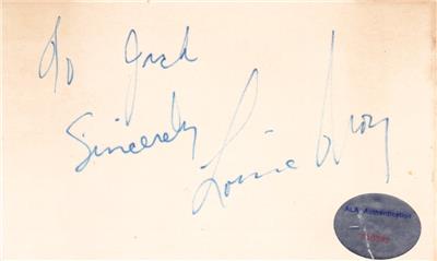Signature is hand-signed "To Jack, Sincerely" on 3X5 Index Card. Died 1994. Card is tanned due
