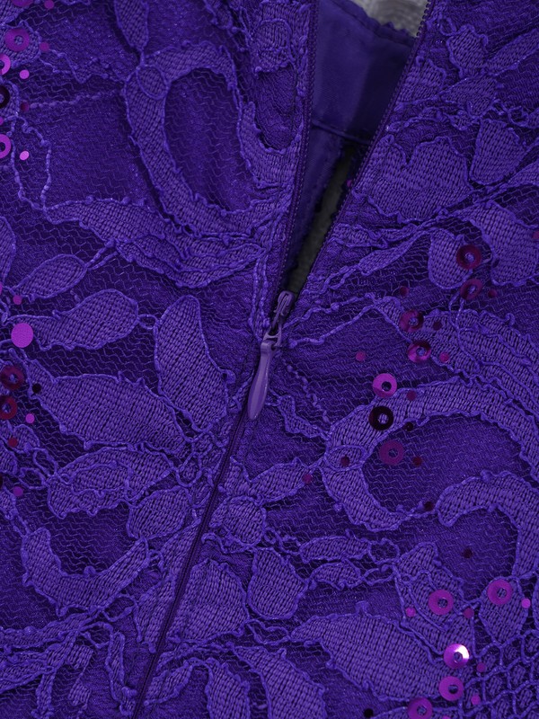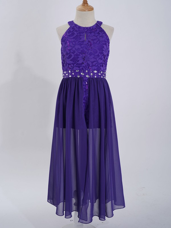Sleeveless, round neckline, floral lace top bodice, rhinestone trim at the waist. Hidden back zipper closure.